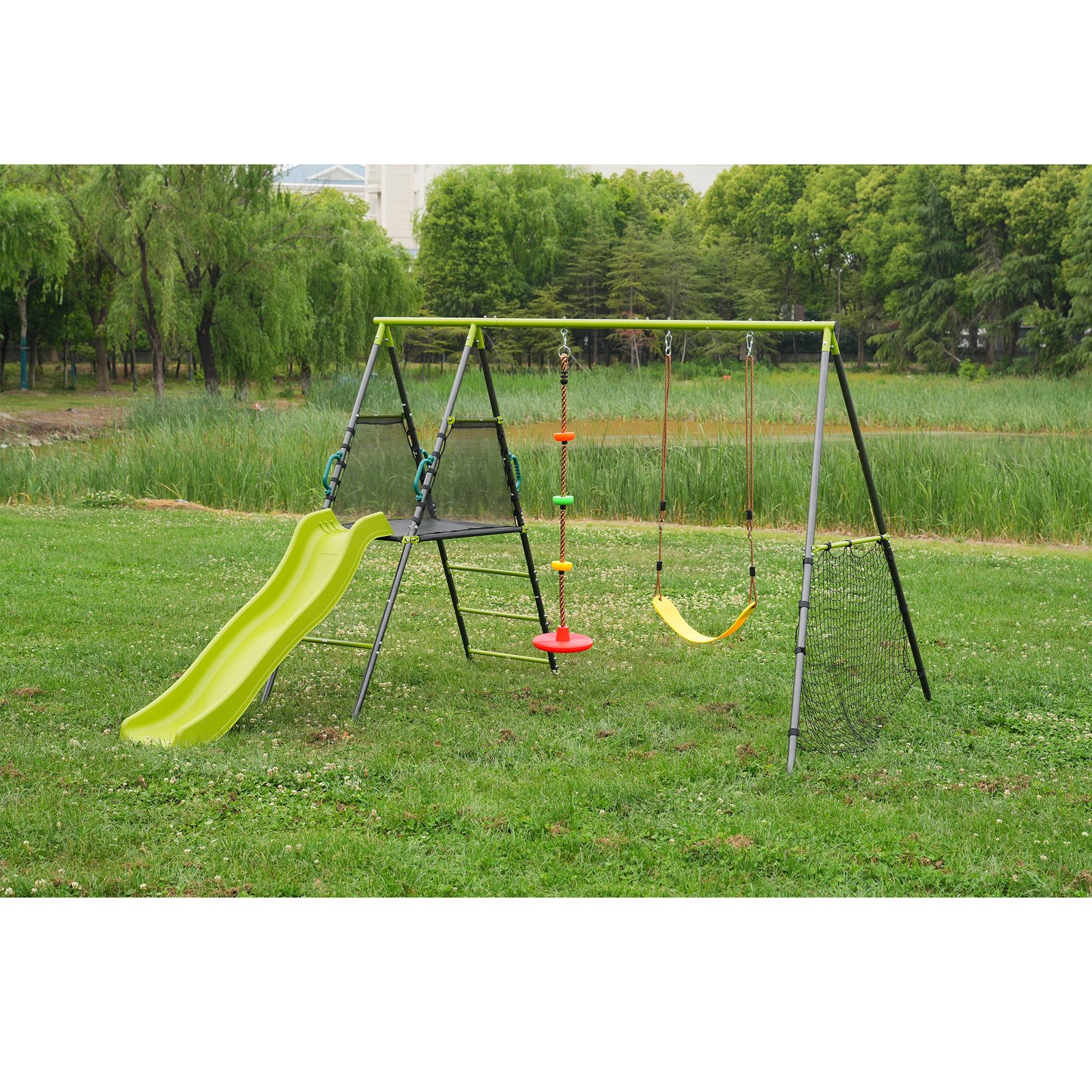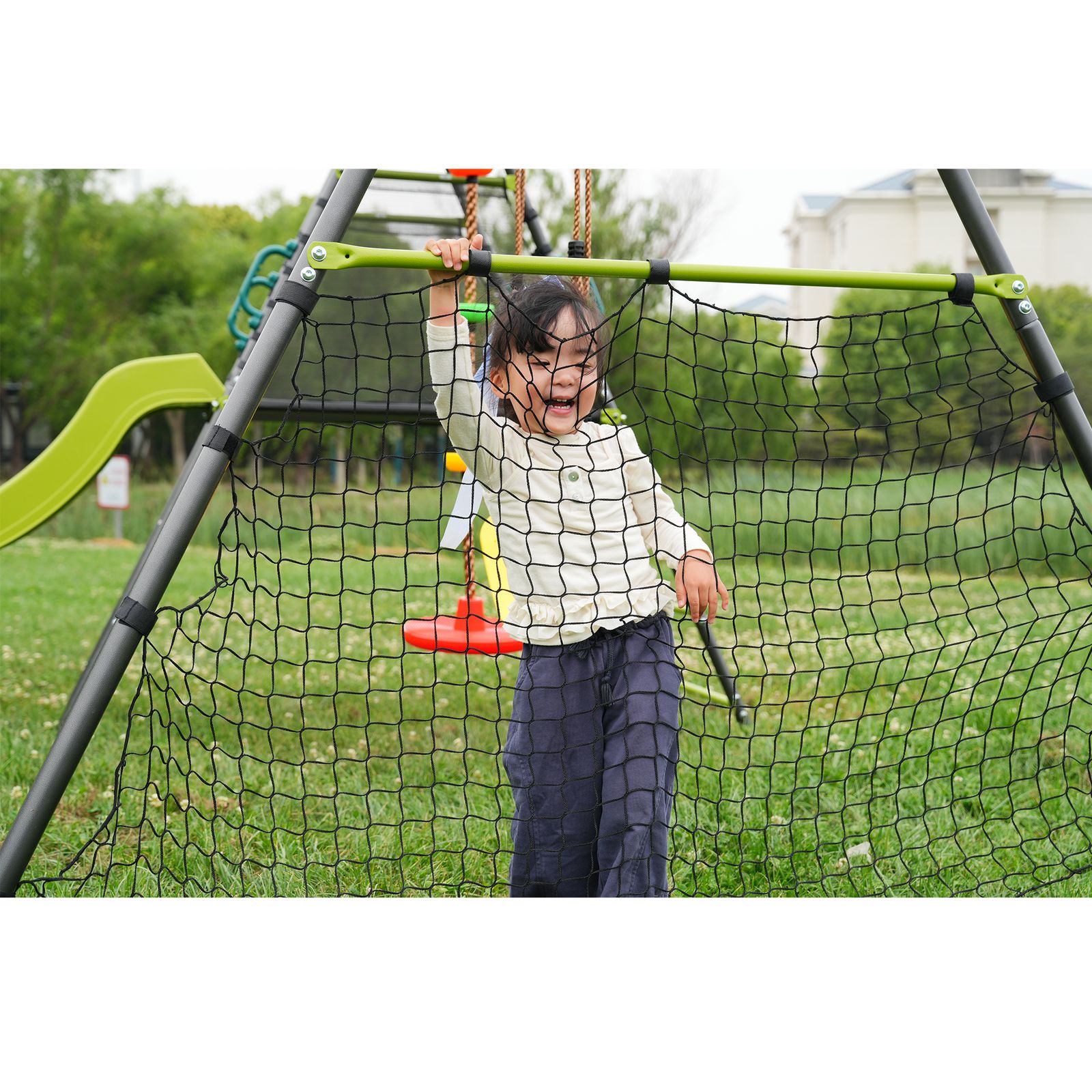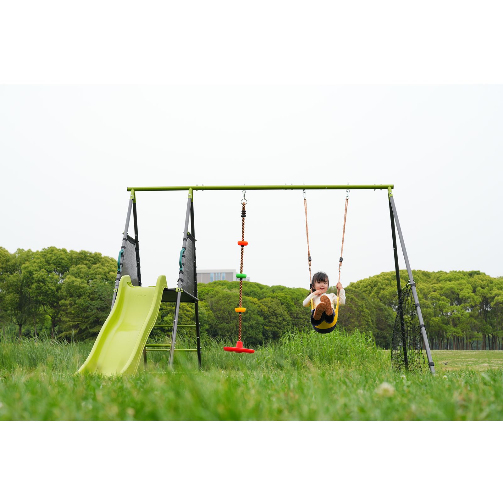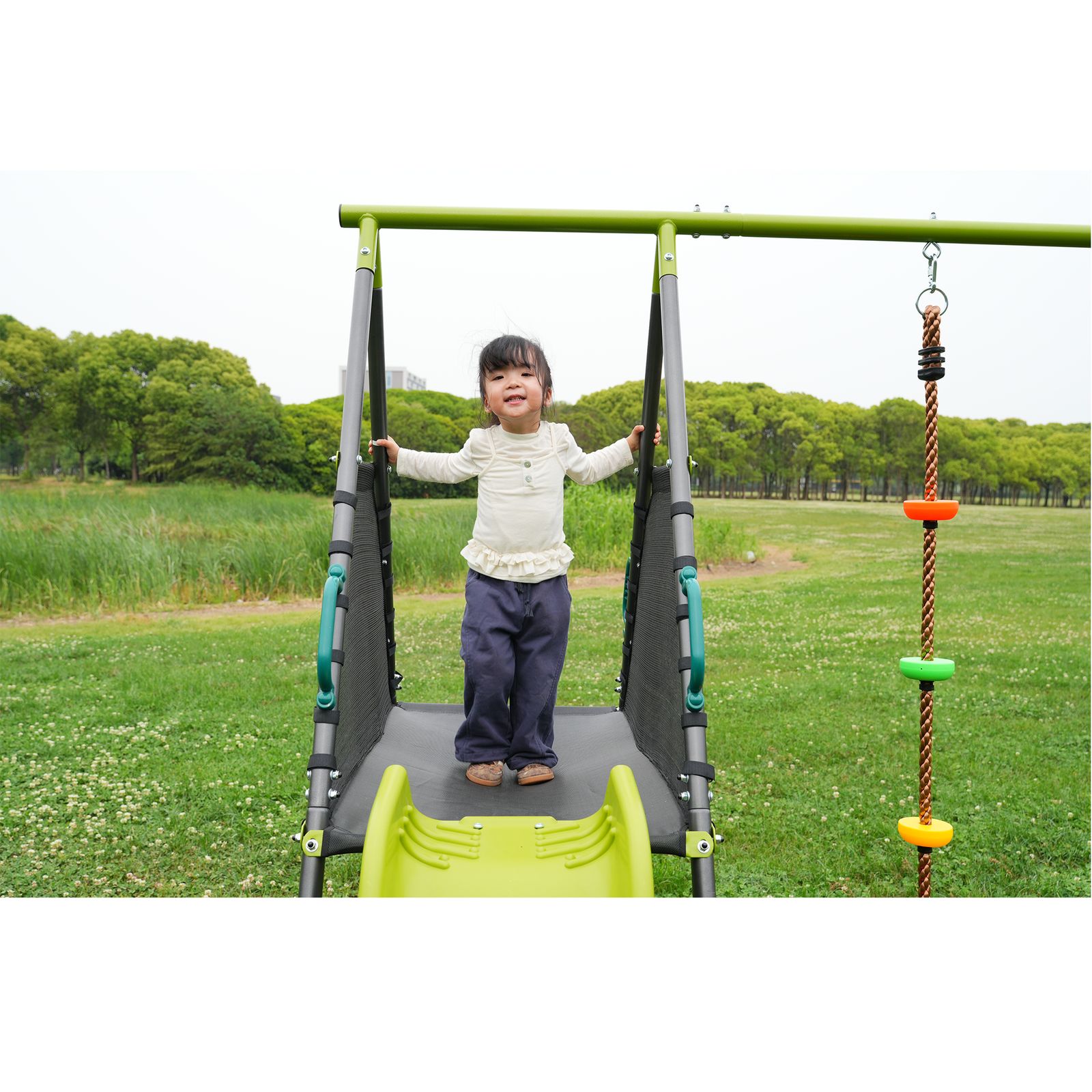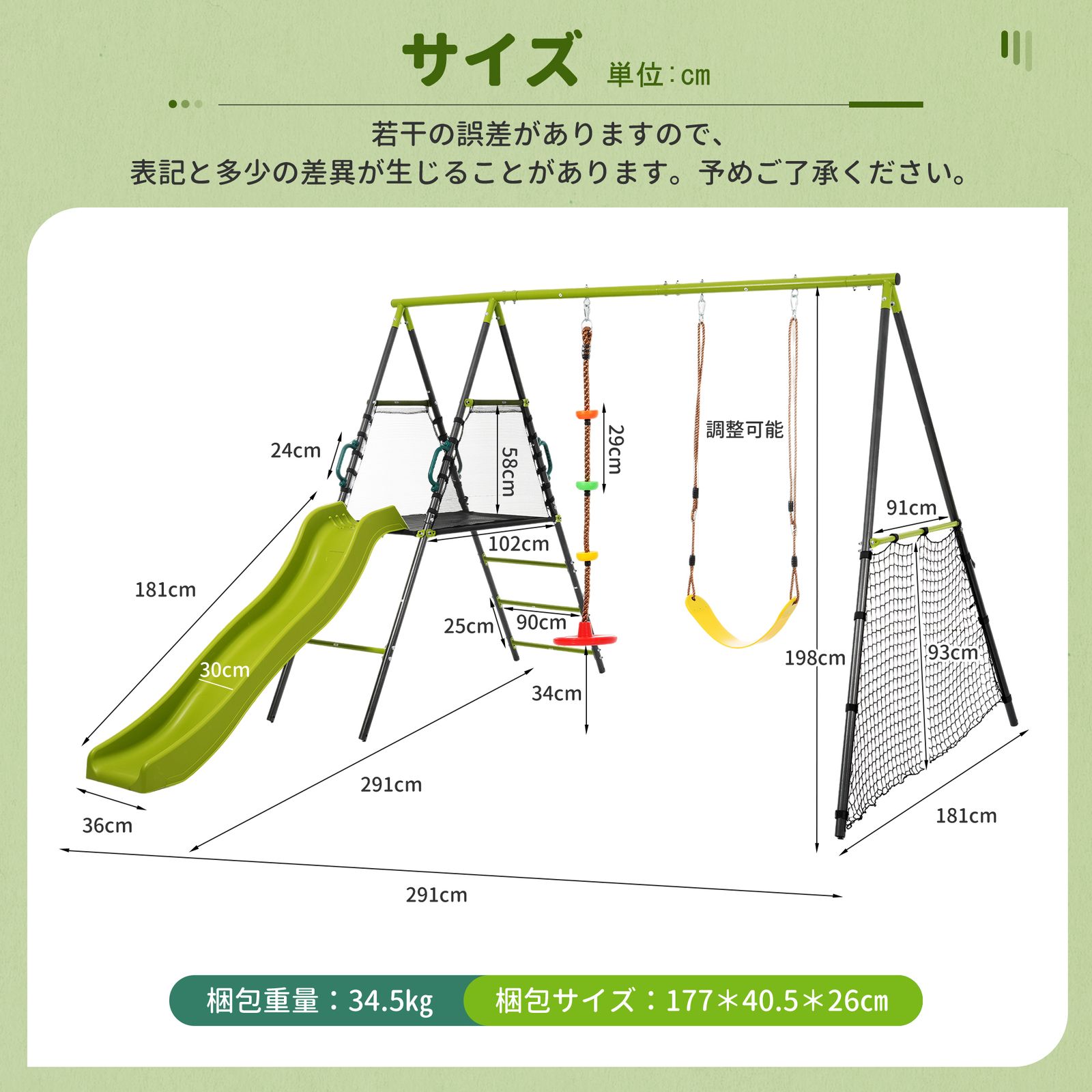 ◎02【4大遊び機能】「1台で運動能力・挑戦心・社会性を育む」滑り台&登り台:手すり+側面防護ネットの二重ガード付き。凹凸滑り止め付きで、初めての滑り台でも安心。登り口:握りやすい手すり付きで慎重派のお子様も安心中段:広めのステップスペースで休憩可能。達成感を育てる安全設計:両側ネット+転落防止ガード滑り面:上部に凹凸の滑り止め加工あり クライミングロープ握りやすいカラフルな4段ステップ構造で、遊びながら体幹・握力・挑戦心を自然と育む設計です。上部はチェーンロック式で、取り外しも簡単。使わないときのお手入れや収納もラクラク!ブランコ"高さ調節可能なロープで、3歳頃から小学生まで成長に合わせて使えます。 チェーンロック式金具で取り外しも簡単。使わないときはコンパクトに収納可能。サッカーネット マジックテープ式で使わないときの片付けも簡単。 お庭がすぐにミニサッカー場に早変わり。家族やお友達と楽しくキック練習ができます!