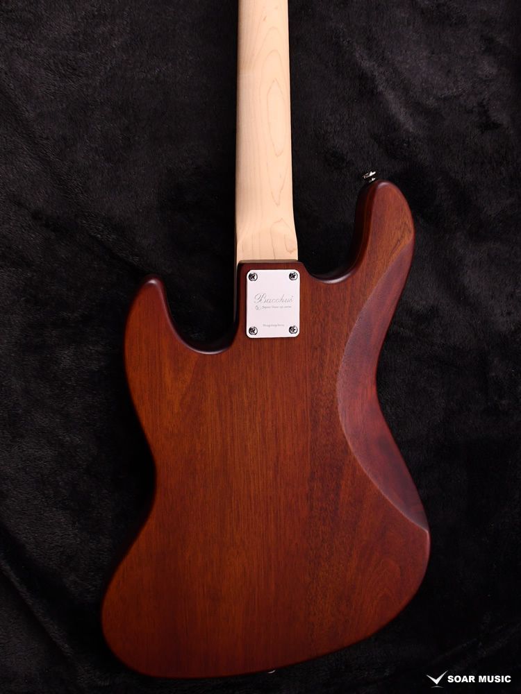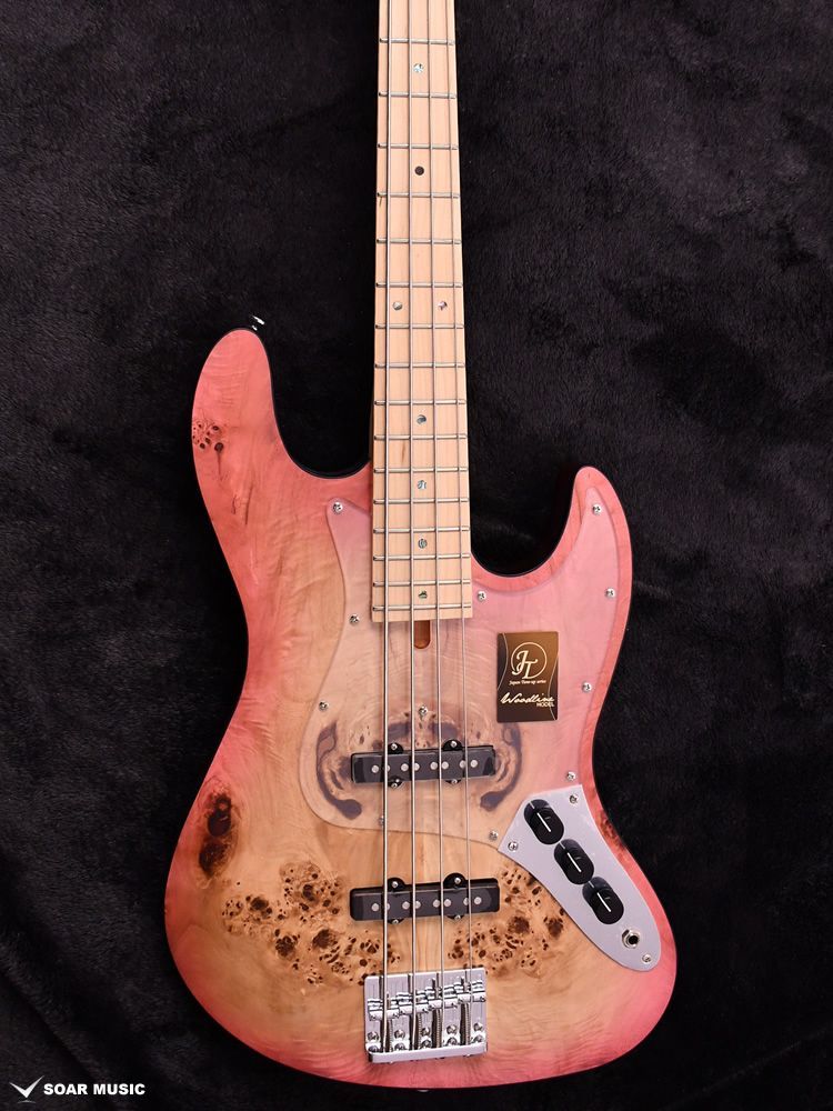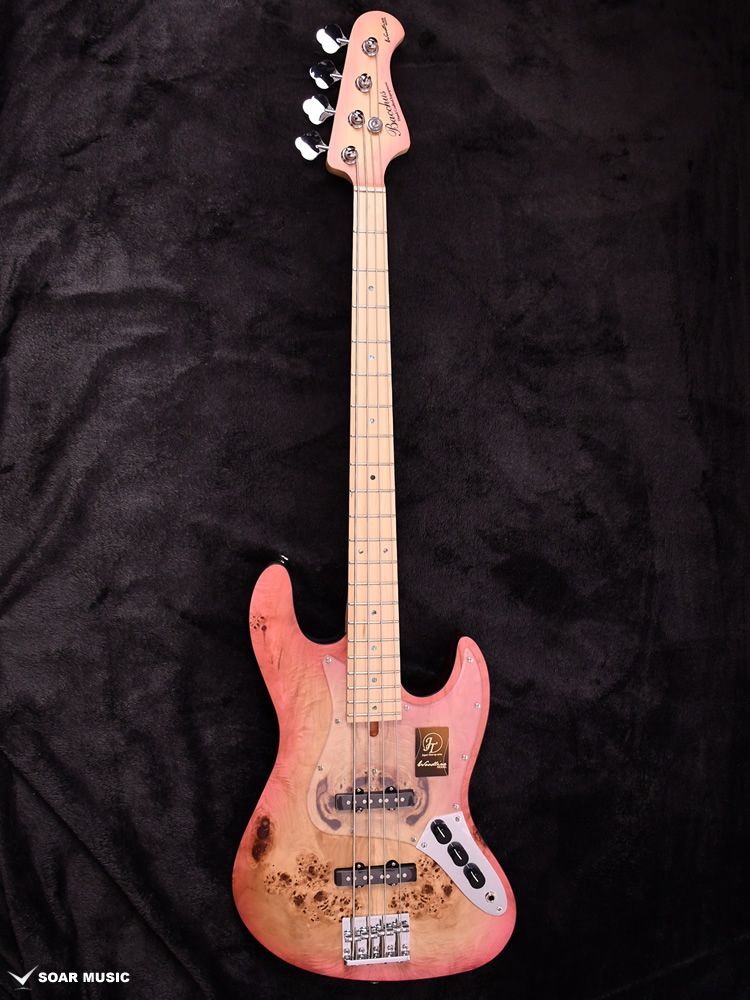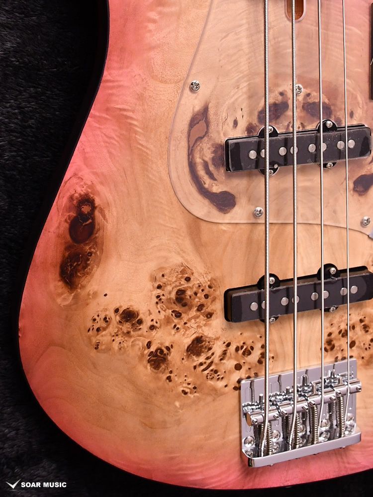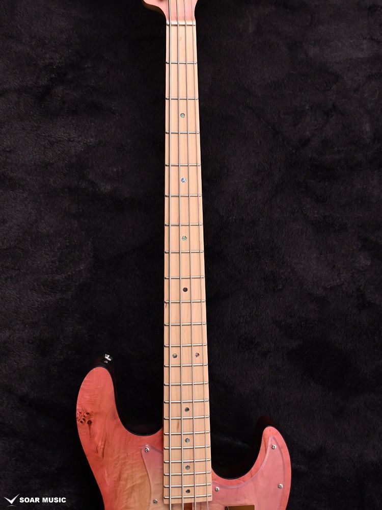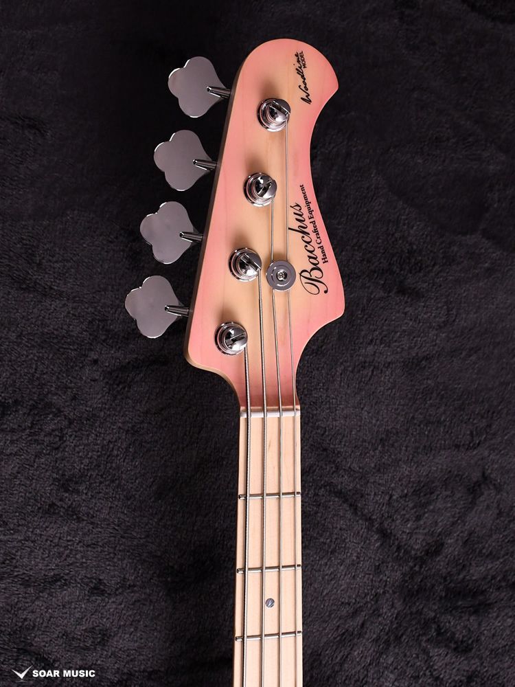 ボディトップを飾るのはバール杢の出ているポプラ材。ポプラは主に北米に分布する木ですが、北海道のポプラ並木など日本でも馴染みのある木材です。本モデルは過去にBacchus Handmade Seriesから限定モデルで登場した、KRB(渓流ブルー)とSYP(ソメイヨシノピンク)のカラーリングを踏襲した淡い色合いで仕上げています。薄い色のバーストは技術を要しますが、国産モデルを製造している飛鳥工場の職人の熟練した塗装技術を再現。メイプルの指板を含めてベース全体の外観を柔らかな雰囲気でまとめました。