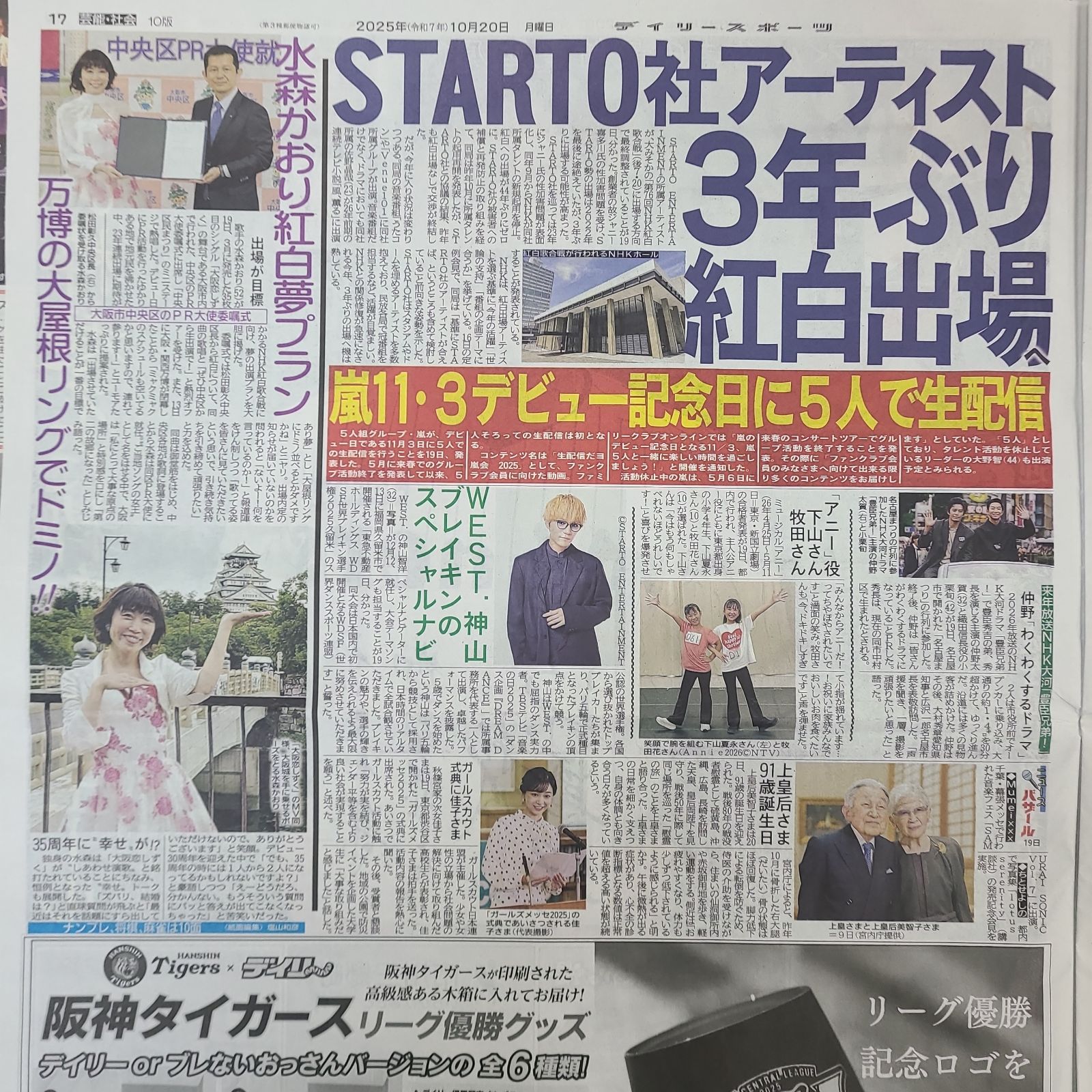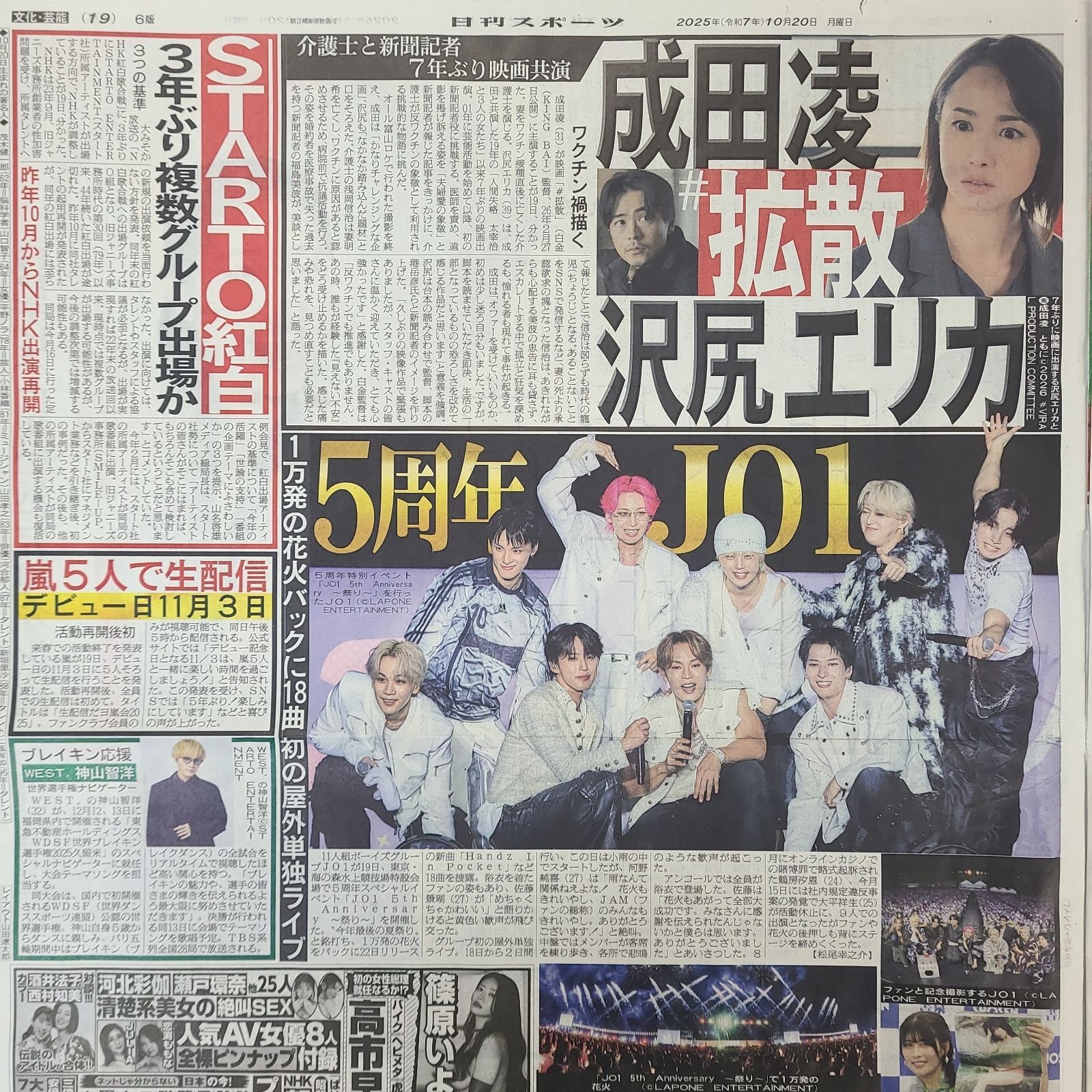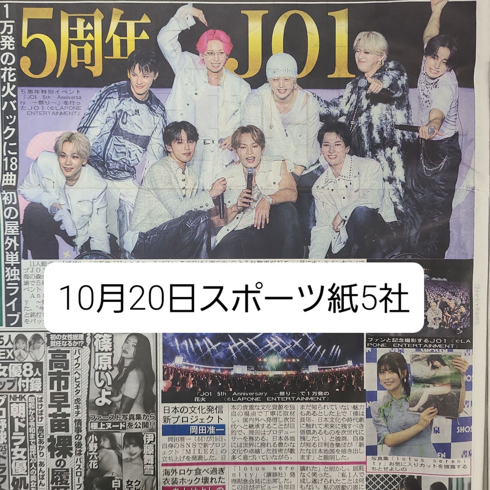 即購入OK!! 掲載期間:1日程度!! 徐々に値下げ致しますので 値下げ不可!!新聞まるごと発送致します。 在庫無くなり次第削除致します。 お早めに!! 匿名配送!送料込み! 10月20日 朝刊  スポーツ紙全5社 ☆ JO1 5周年 1万発の花火 バックに18 曲!!                  他          上記の記事は5社掲載あり!! 新聞はまるごと発送致します!! 日刊スポーツ スポーツ報知 スポニチ ディリー サンスポ 切り取りはございません。 厚みの関係で新聞まるごとの 同梱発送出来ません。 同梱希望は 掲載面のみ3セット以下で発送致します。 コメント下さい!専用出品致します。 追加 1セットにつき 送料 220円値引きします 数に限りがあるためバラ売りは出来ません。 まとめ売りは10セット以上20セット以下で 1枚100円 送料が一律 1000円です。 新聞はまるごと発送致します。 早めにコメントいただければ 対応できるかと思いますのでよろしくお願いいたします。 関東版の新聞になります。 目立つダメージはございませんが、店頭に陳列されていたものですので、多少のヨレ、折れなどがある場合がございます。 ご理解いただける方のみ ご購入くださいませ。 発送は掲載面保護もあり新聞まるごと 二つ折り後、opp袋で水濡れ対策行いA4サイズの封筒にてネコポス便のみの匿名発送で致します。 到着後何かございましたら評価前に コメント下さいませ。 返品、返金、対応致しますので ご安心下さいませ。 #山田涼介 #SexyZone #中島健人 #佐藤勝利 #マリウス葉 #菊池風磨 #松島聡 #SixTONES #ジェシー #田中樹 #高地優吾 #京本大我 #松村北斗 #森本慎太郎 #ジャニーズWEST #重岡大毅 #藤井流星 #神山智洋 #中間淳太 #King&Prince #キンプリ #平野紫耀 #神宮寺勇太 #岸優太 #髙橋海人 #永瀬廉 #櫻井翔 #相葉雅紀 #二宮和也 #大野智 #松本潤 #ジャニーズ #SnowMan #スノーマン #ラウール #岩本照 #目黒蓮 #深澤辰哉 #佐久間大介 #渡辺翔太 #向井康二