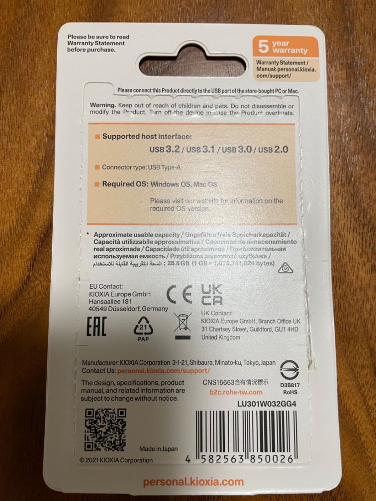 ・型番:KIOXIA キオクシア TransMemory U301 キャップ式 ホワイト