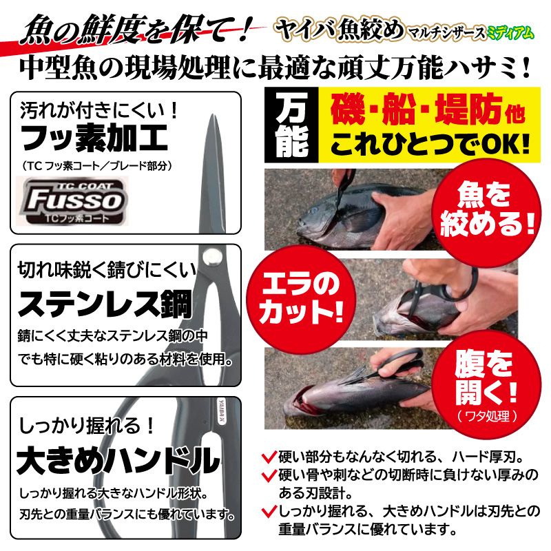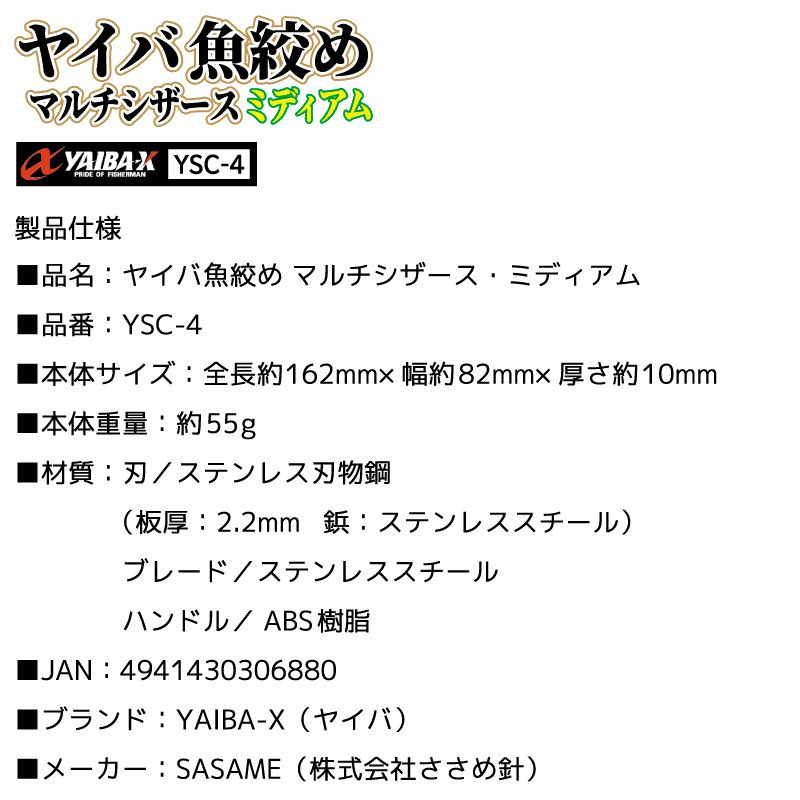 ヤイバ魚絞め マルチシザース ミディアム 釣り YSC-4 ハード厚刃 ステンレス フッ素樹脂加工 大きめハンドル ハサミ SASAME