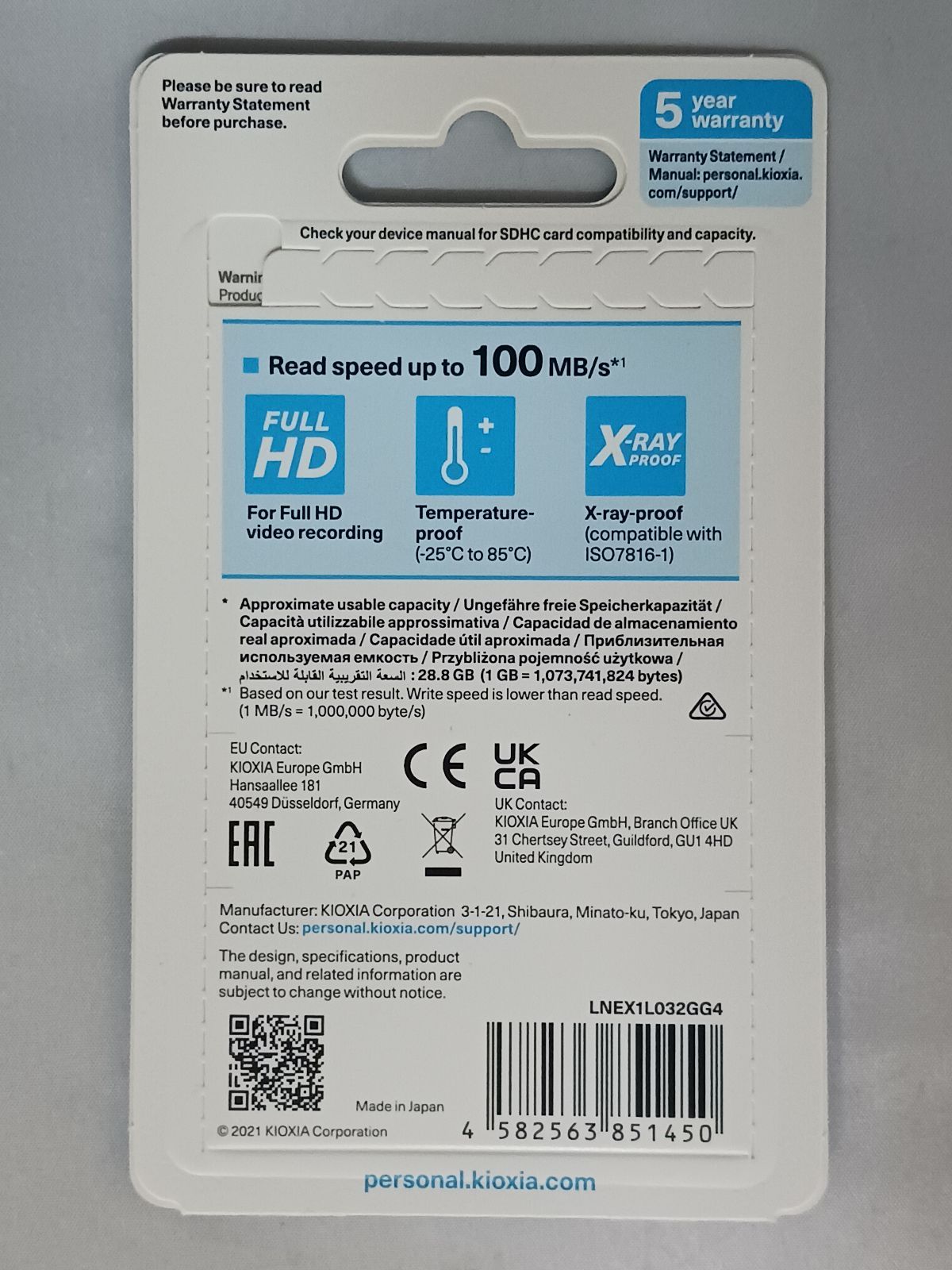 【新品・未開封】Kioxia 32GB Exceria SDメモリカードSDHC UHS-I U1 Class 10 リード100MB/秒。 32GB LNEX1L032GG4