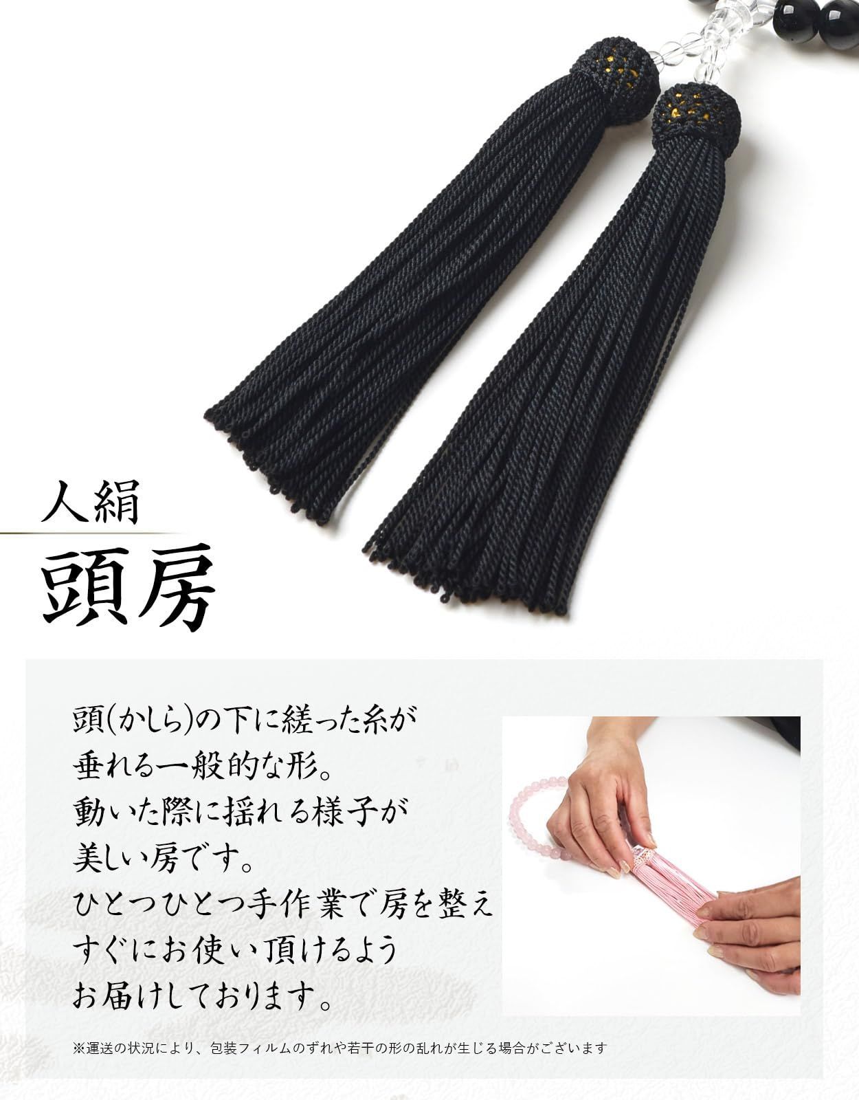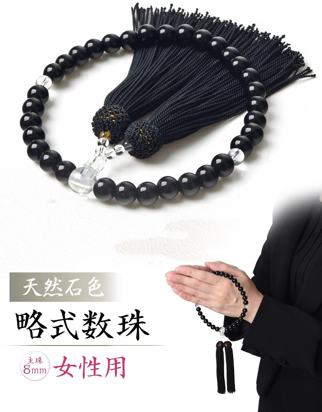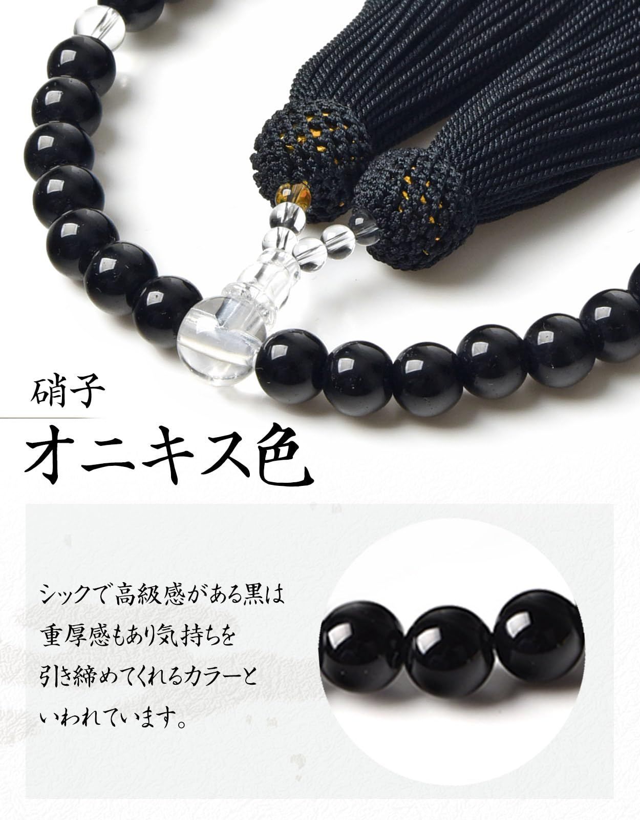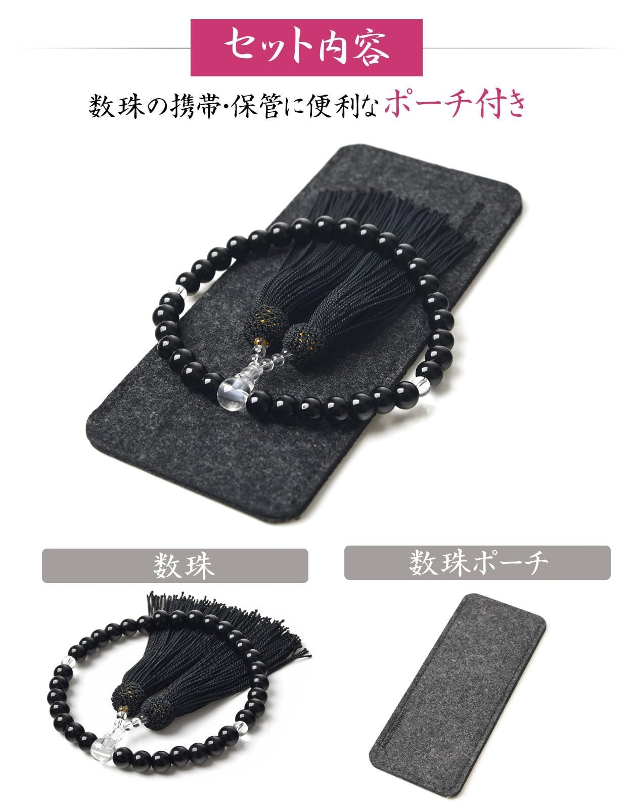 【数量限定】天然石色 数珠袋付き 葬儀 人絹房 法事 選べるお色 すべての宗派で使える 略式数珠 硝子 (オニキス色) 頭房 8mm 女性用 【EsuonHappiness】数珠