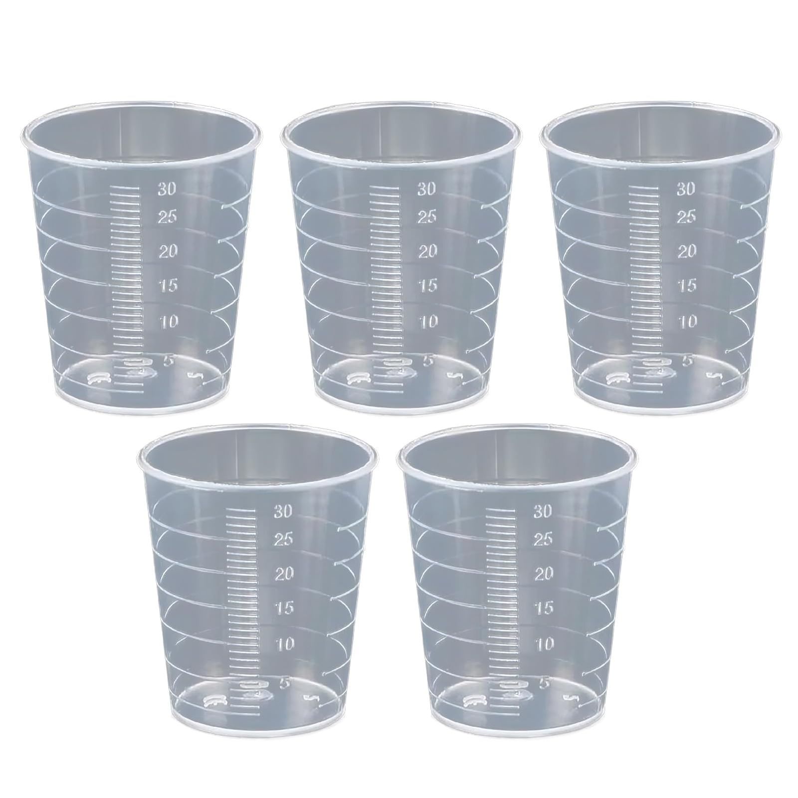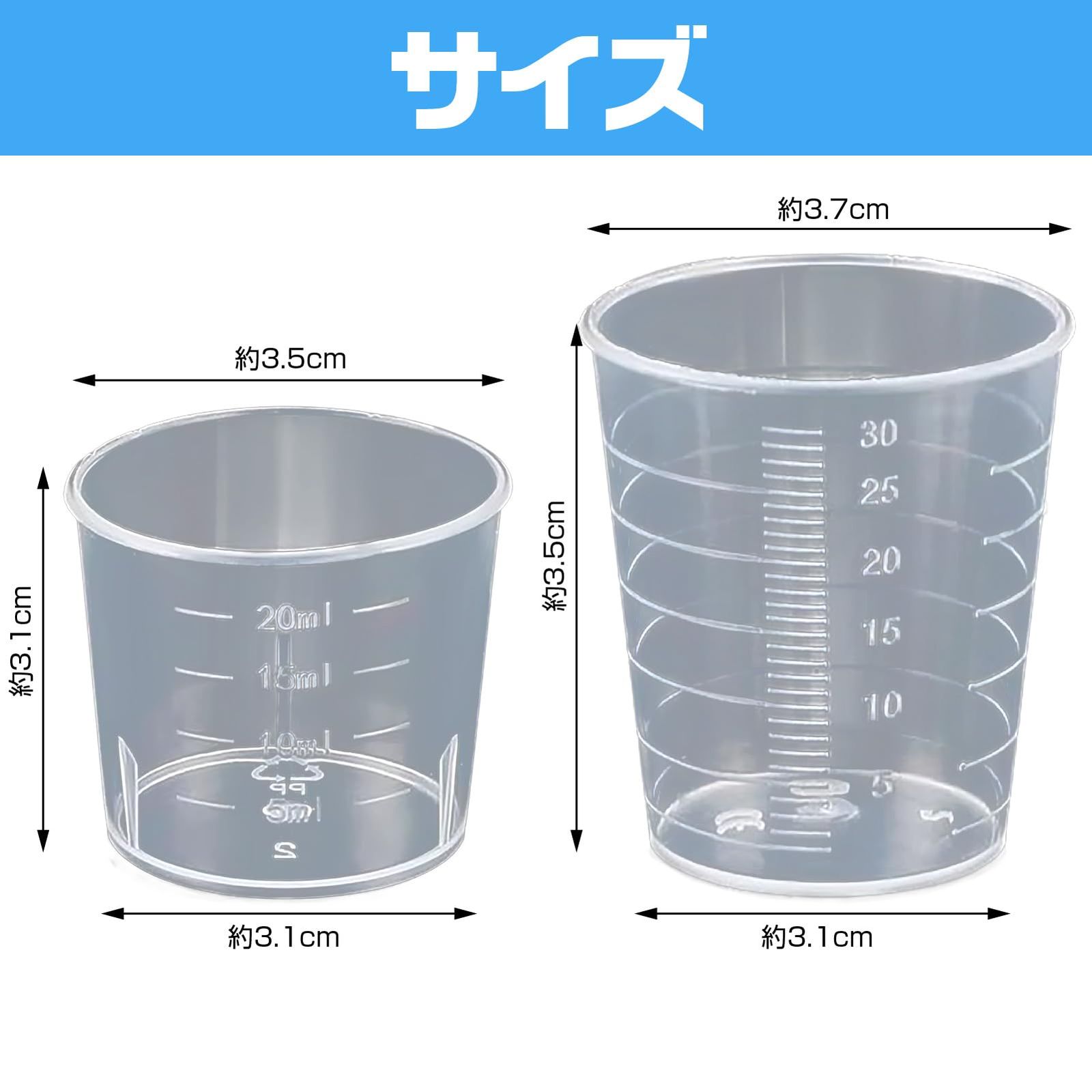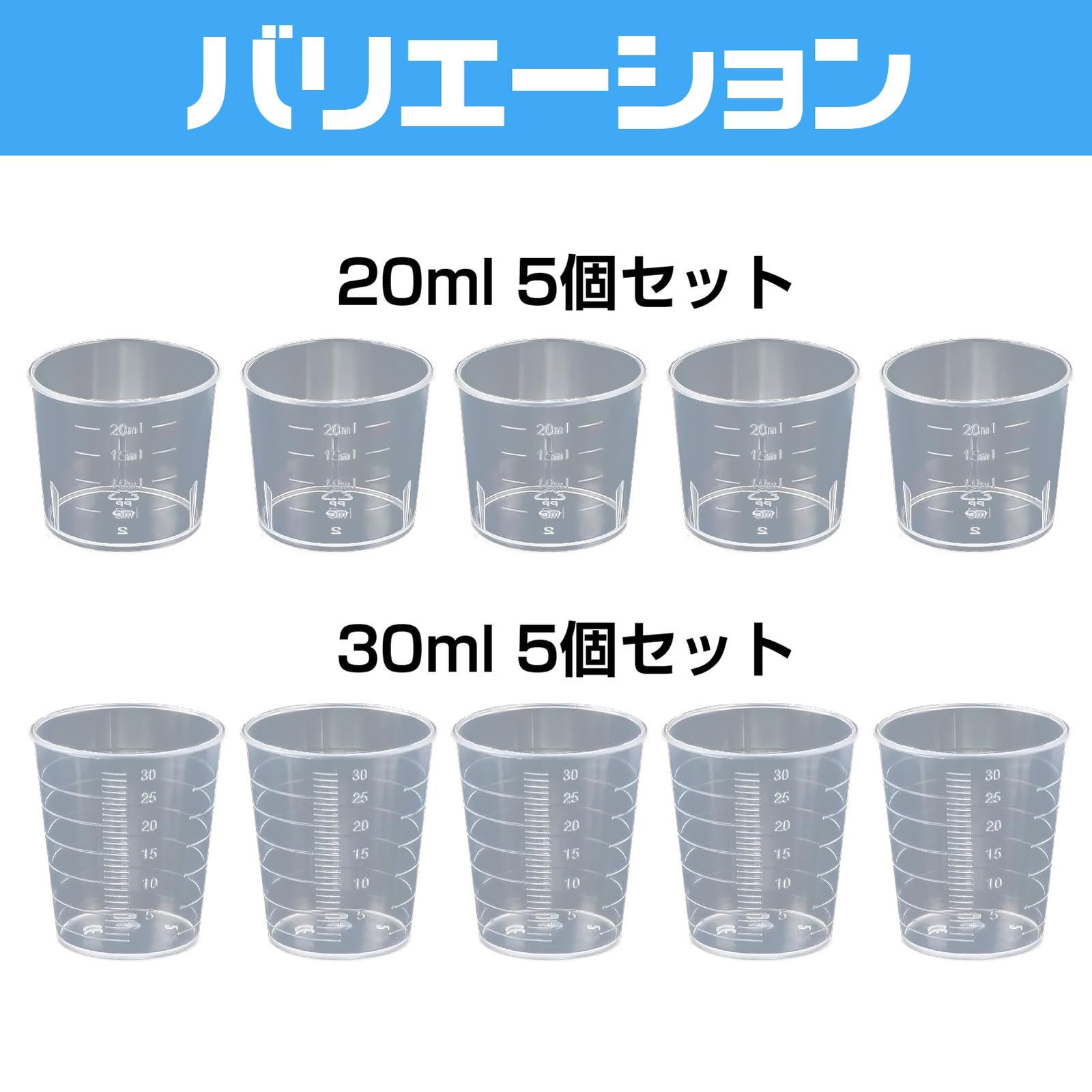 【商品仕様】セット内容:プラスチックビーカー×5個 材質:耐久性プラスチック(PPまたはPE) 容量:20ml/30ml(各5個ずつ)