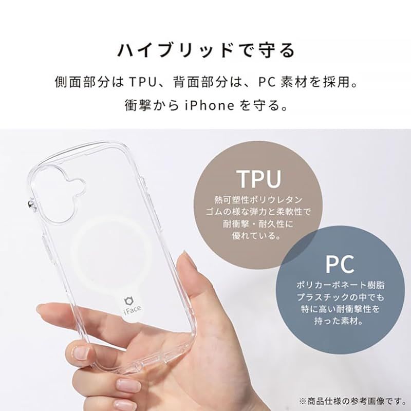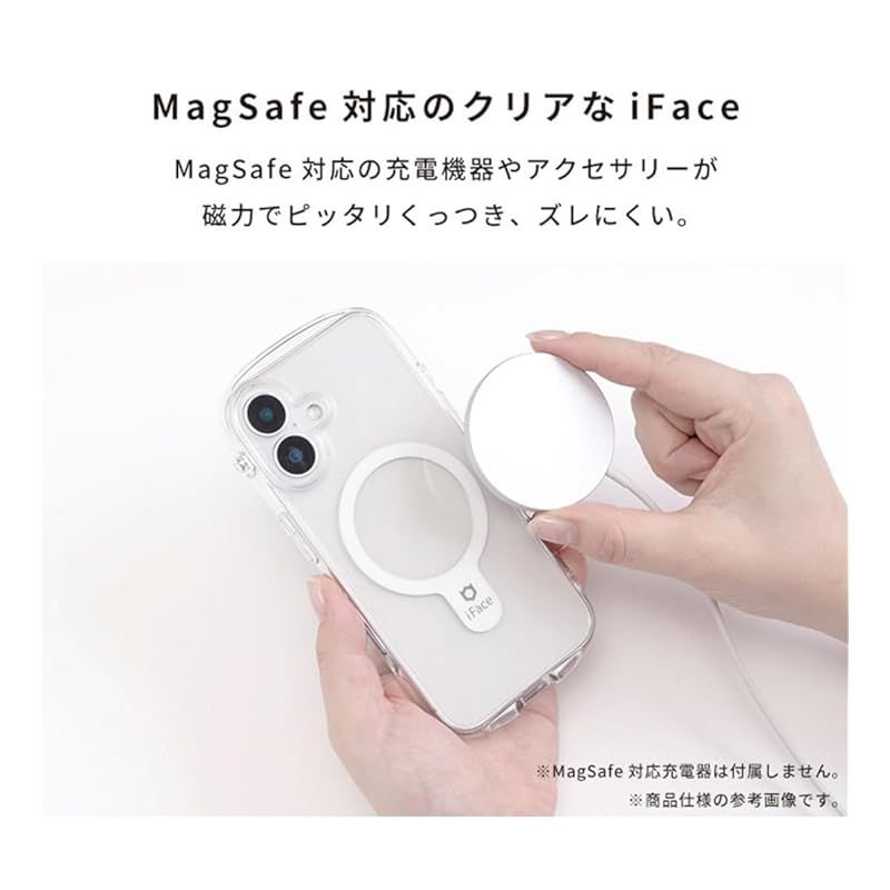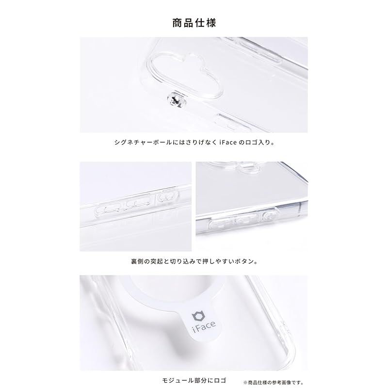 ・クリアな背面に、シールや写真を入れてカスタマイズが可能・手にしっかりフィットする「くびれ」形状で持ちやすさ抜群・側面部分は弾力のあるTPU、背面部分は硬いPC素材を採用・画面とカメラを守る、フチ高設計・側面のドット加工で密着痕を防止・サイドホールもしっかり対応。カメラコントロールへのアクセスもスムーズに。・MagSafe充電/各種MagSafeアクセサリー対応・選べる2カ所のストラップホール・iFaceストラップホルダー専用設計でショルダーストラップの使いやすさアップ※ストラップホルダーを併用する場合は、iFaceから発売している製品をご使用ください。類似品ではiFaceケースと併用の使用感をしかねるため、ご注意ください。
