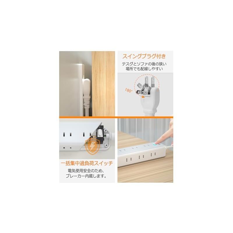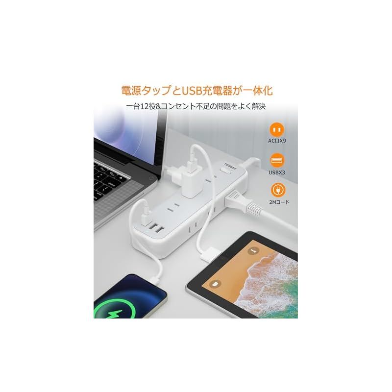 延長コード 2m 電源タップ usb付き コンセントタップ 9個AC口 3個USB-Aポート TESSAN テーブルタップ 電源コード OAタップ たこあしコンセント タコ足配線 マルチタップ一括スイッチ付き 壁掛け/卓上に 0