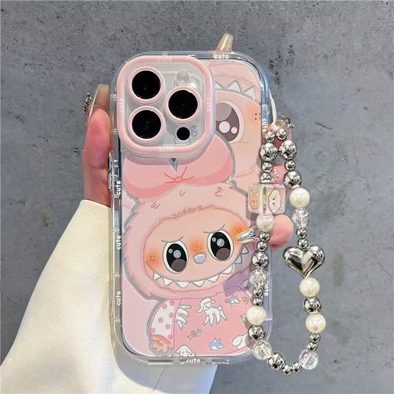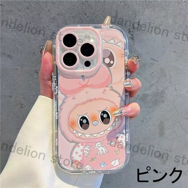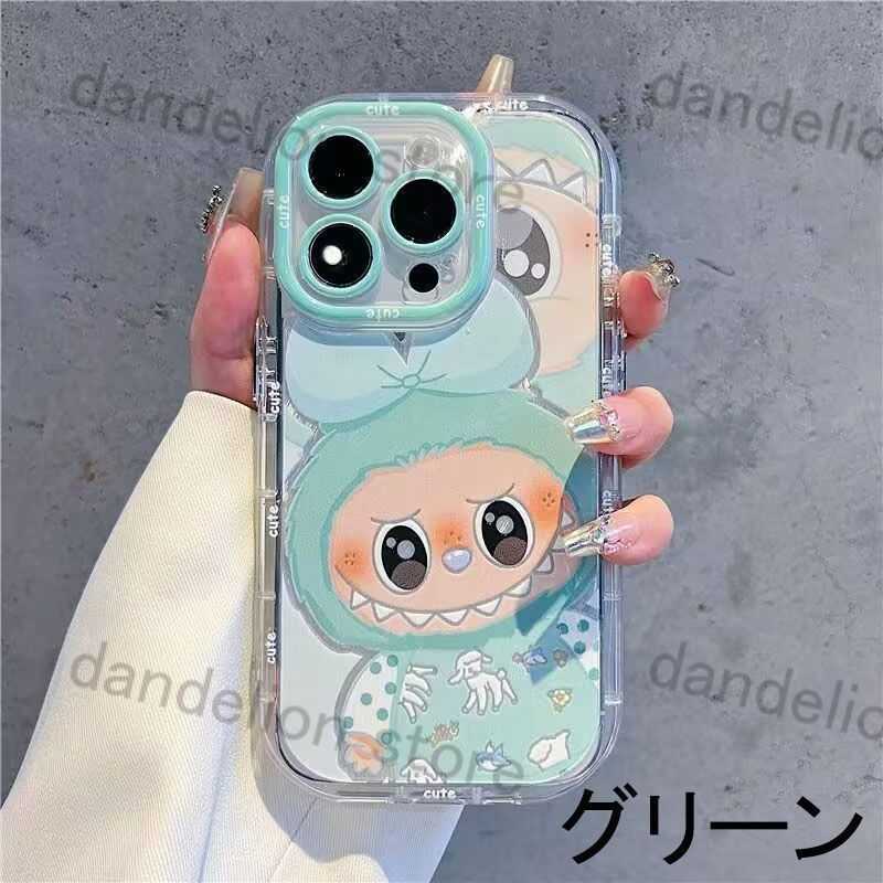 スマホケース ラブブLabubu グリーン ピンク ストラップ付き iPhone対応 アイフォンケース iPhone16pro/15/15pro/15pro max/14/14pr