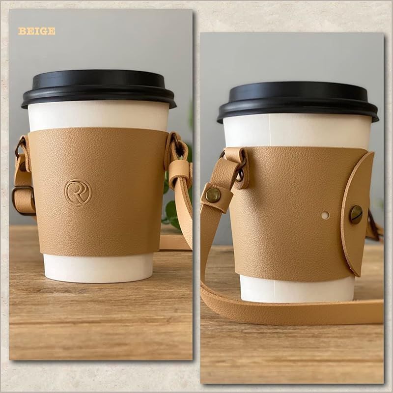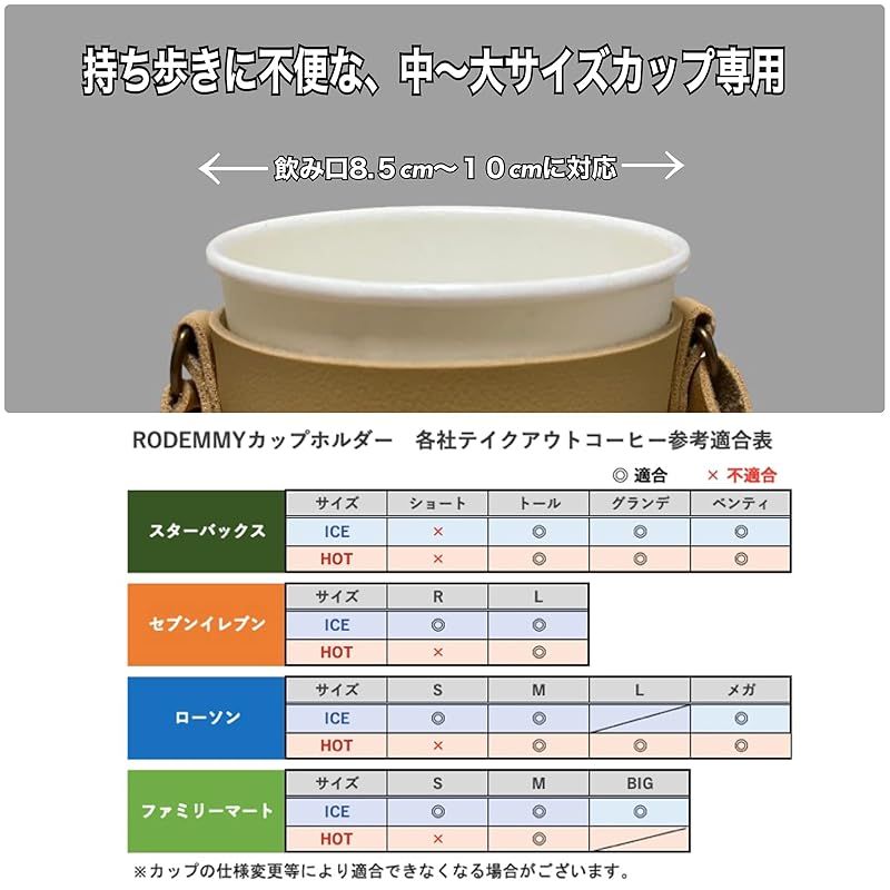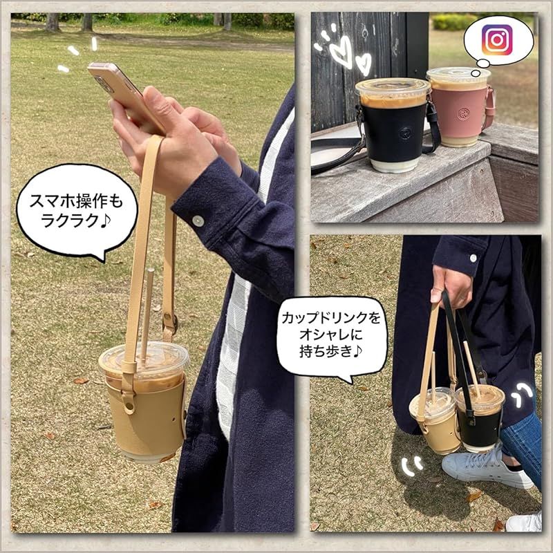 カフェのテイクアウトドリンクやコンビニコーヒーを手軽にオシャレに持ち運べるカップドリンク専用ホルダーです。 持ち歩きに不便な、中?大サイズカップ専用設計。テイクアウトドリンクを持ちながらの財布の出し入れやスマホの操作もスムーズに行えます。(一部のレギュラーサイズやSサイズ等の小さいカップには対応致しておりません。ご使用するカップサイズをご確認の上お買い求め下さい。) カップの大きさに合わせ、組みネジを移動させる事により3段階のサイズ調節が可能です。(飲み口部分8.5cm~10cmまで対応。)シチュエーションに合わせストラップの長さも約50cm~90cmまで調節できます。 テイクアウトカップドリンク専用のホルダーになります。それ以外のドリンク等には対応しておりません。サイズ調整の際はカップの脱落防止の為、組みネジを手でしっかりと締めて下さい。(カップの形状やサイズによっては使用出来ない場合がございます。) 濡れたり汚れたりした際は、乾いた布で優しく拭き取り日光の当たらない場所で乾燥させて下さい。(PUレザー製)
