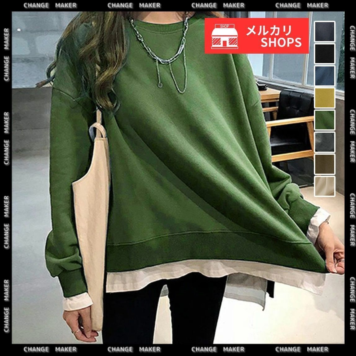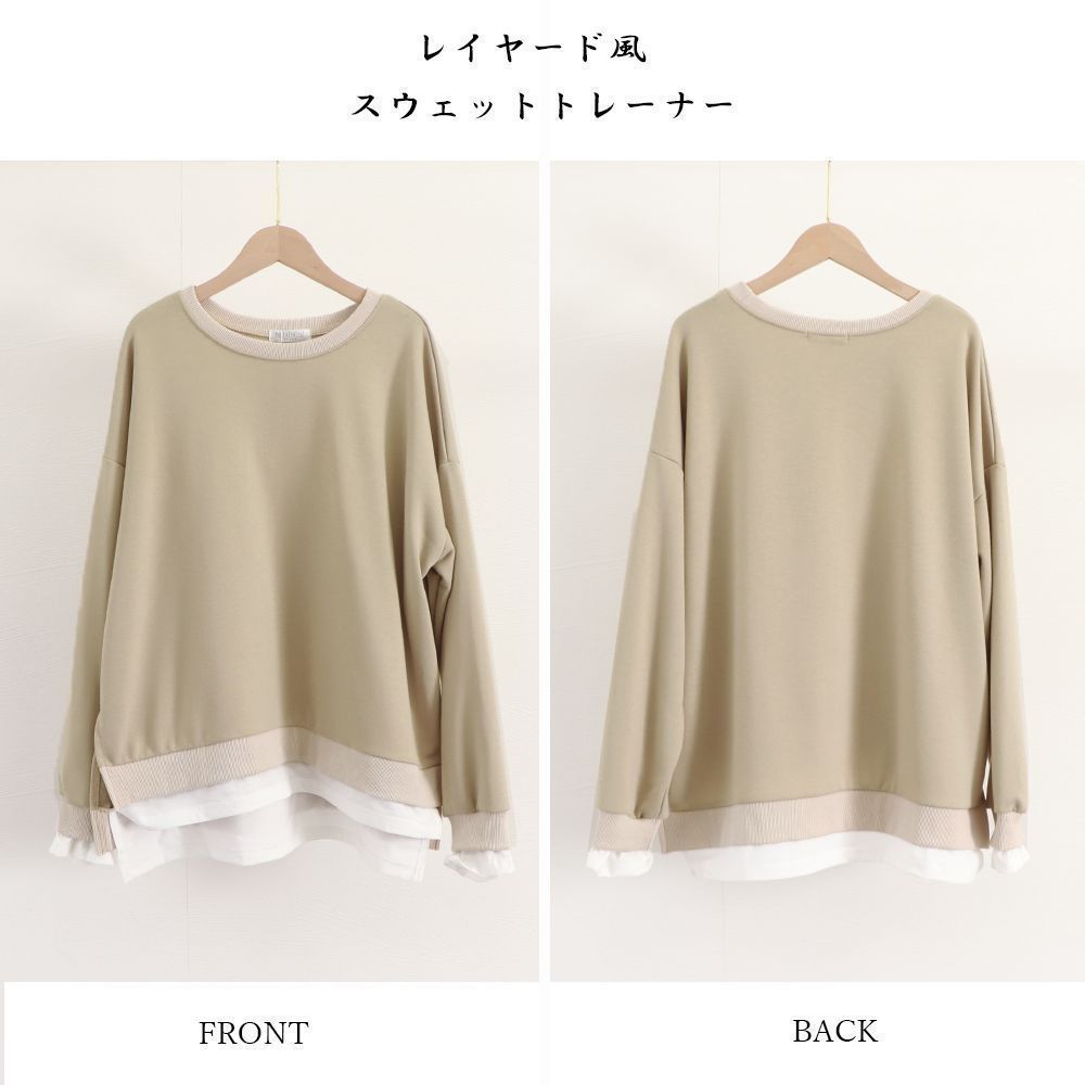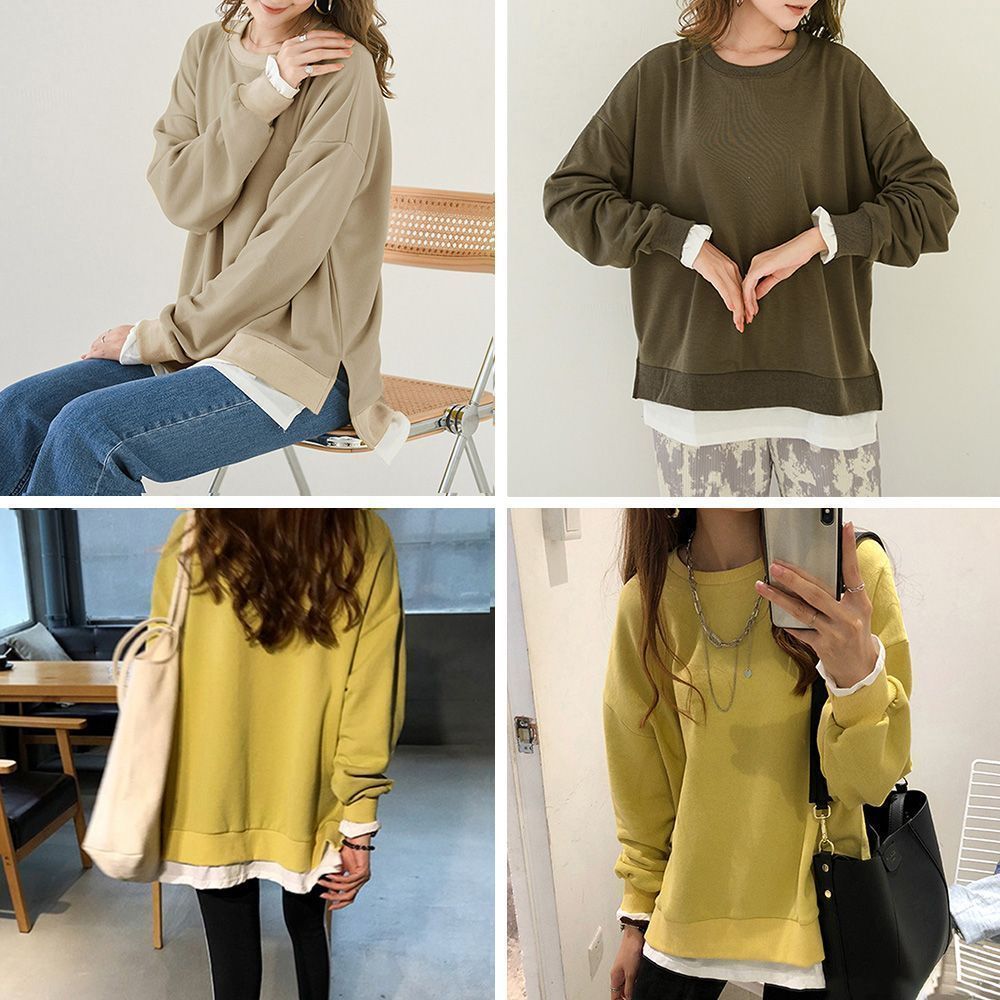 レイヤード風 スウェットトレーナー 春秋 レディース 重ね着風 オーバーサイズ トップス 無地 長袖 クルーネック プルオーバー ゆっ0820