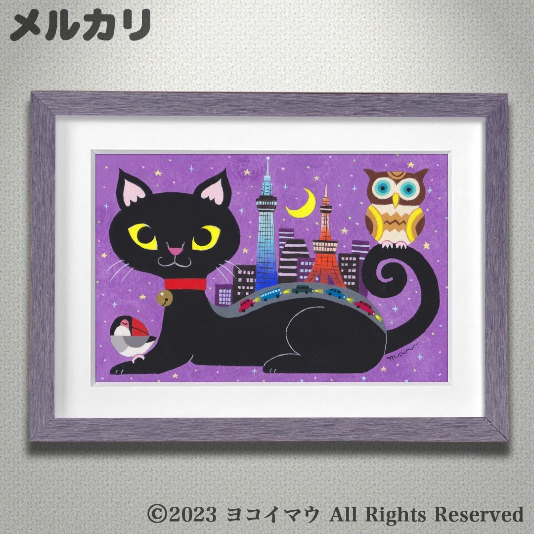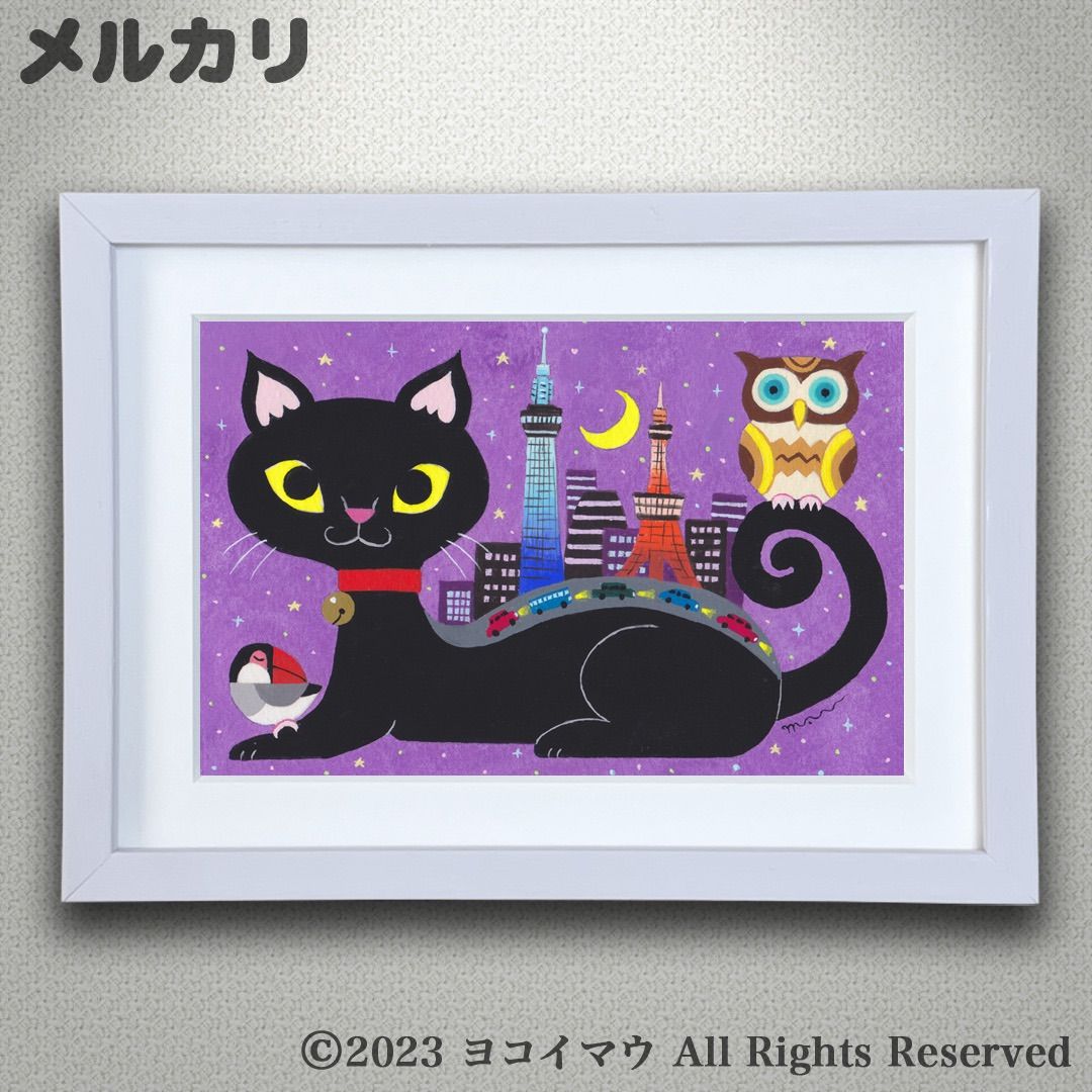 原画「猫の背中に何かある〜黒猫とTOKYOシティ」猫/イラスト/アート/絵画