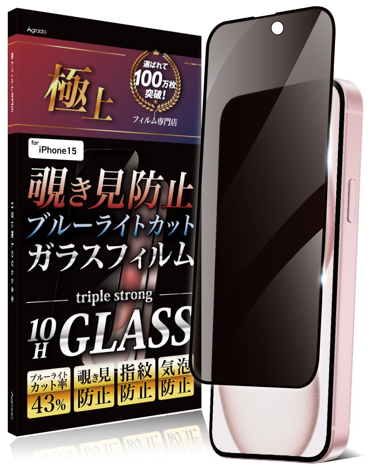 【人気商品】いphone15 全面保護 10H ガラスフィルム 保護フィルム 用 ブルーライトカット iPhone15 フィルム 覗き見防止 10H Agrado