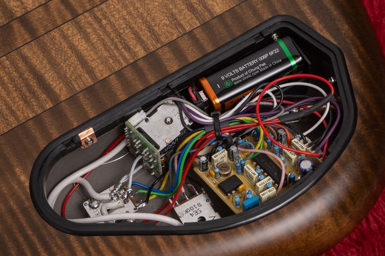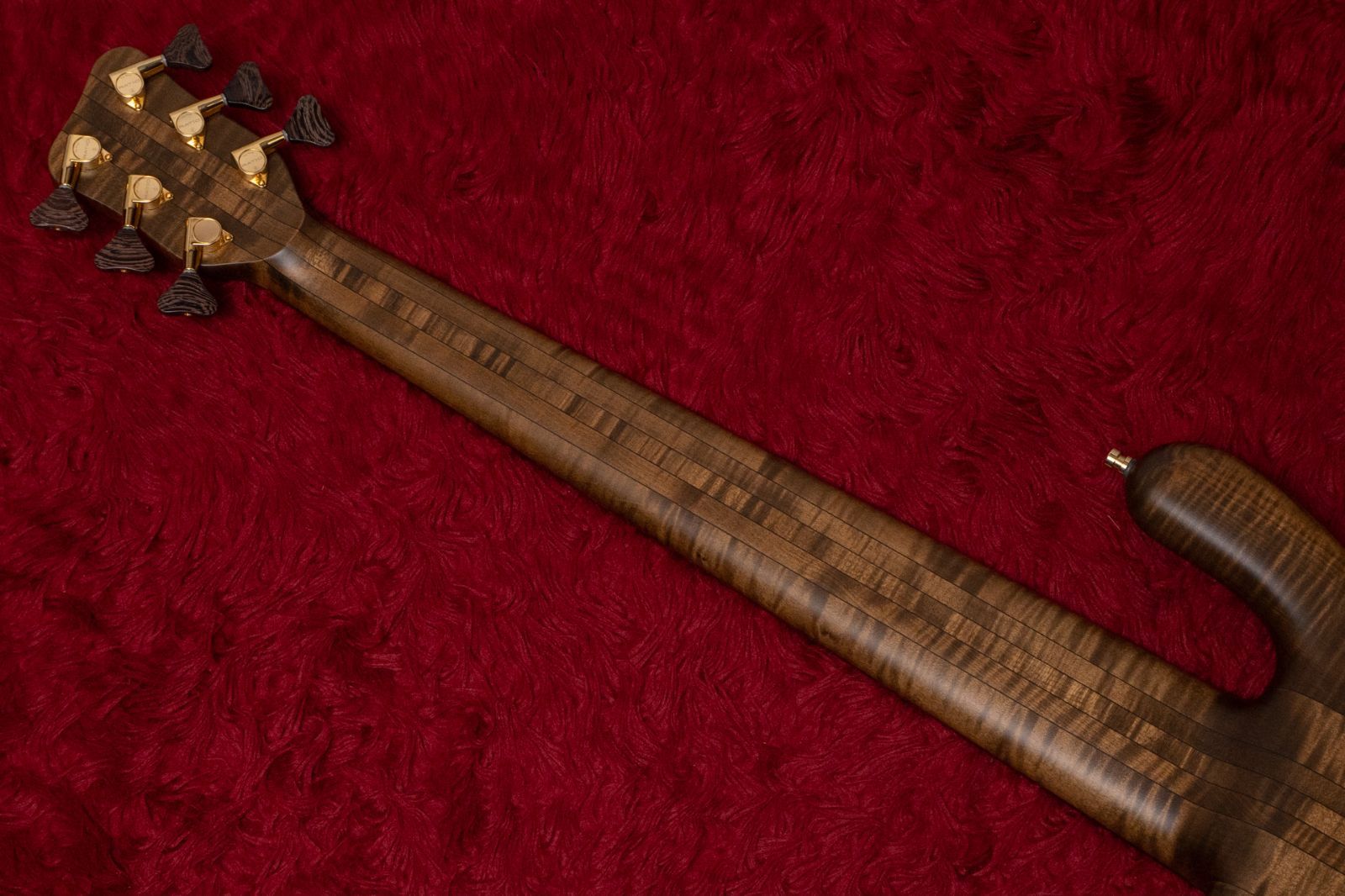 ネックにはFlamed Mapleを軸としたラミネートタイプ、指板はWengeという構成。