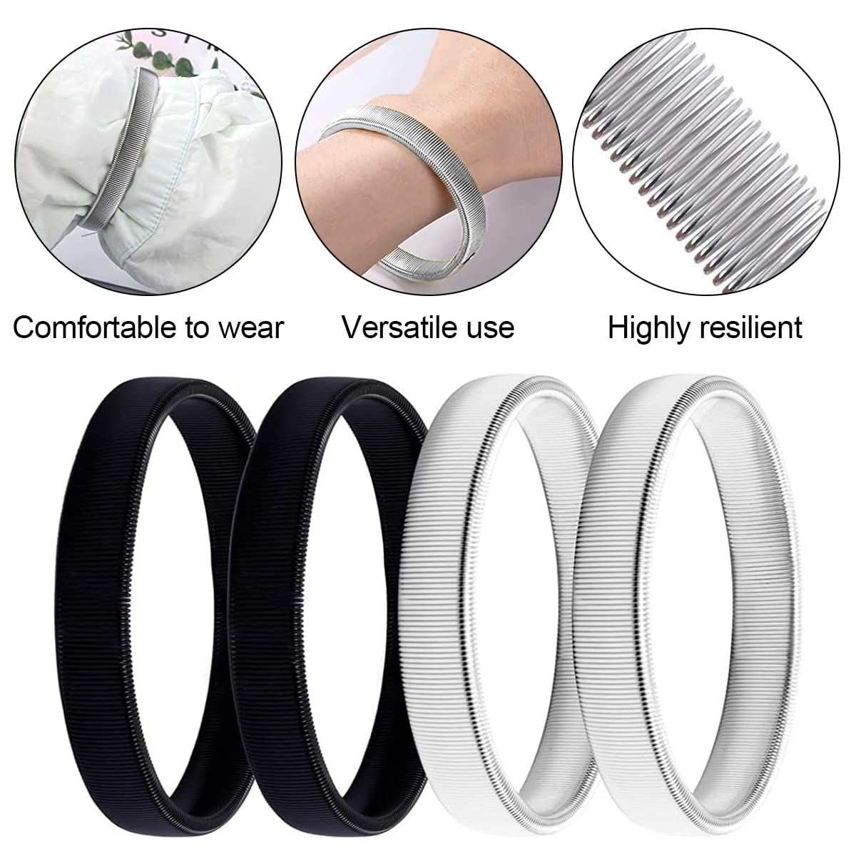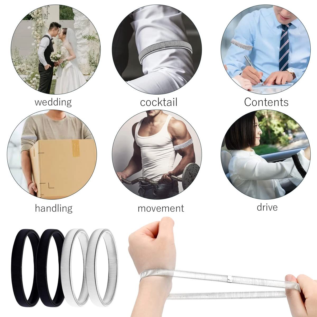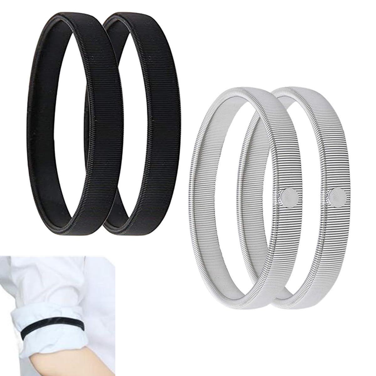 【迅速発送】WinsGreat 4個セット アームバンド メンズ レディース スプリングループ式 腕バンド 袖丈 着脱簡単 伸縮性 男女兼用 結婚式 卒業式 入学式 (ブラック+シルバー)