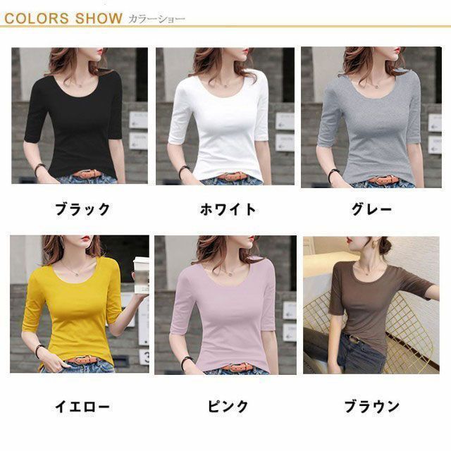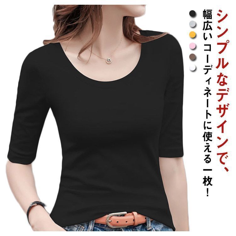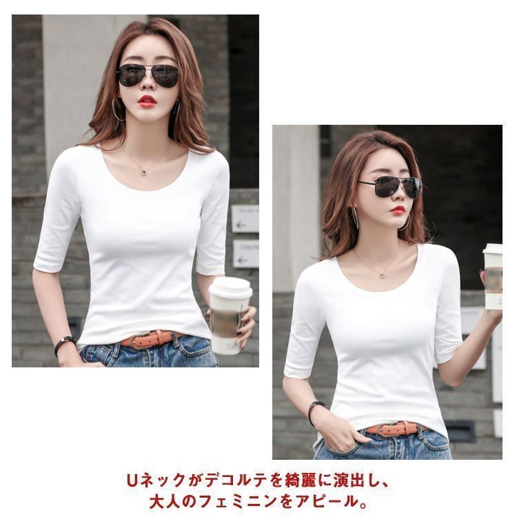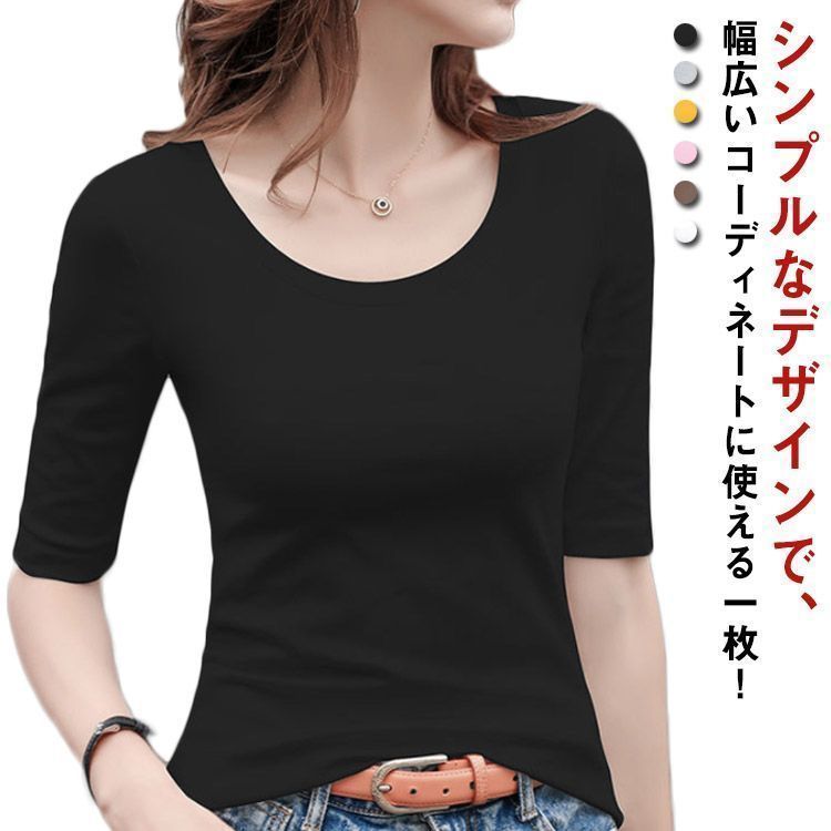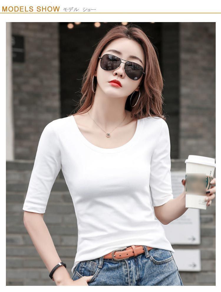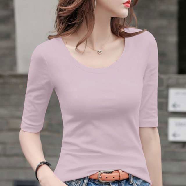 新品 全6色 5分袖Tシャツ Tシャツ カットソー 春秋 ストレッチ Uネック レディース トップス 綿 夏 コットン 5分袖 タイト tシャツ 無地 ス