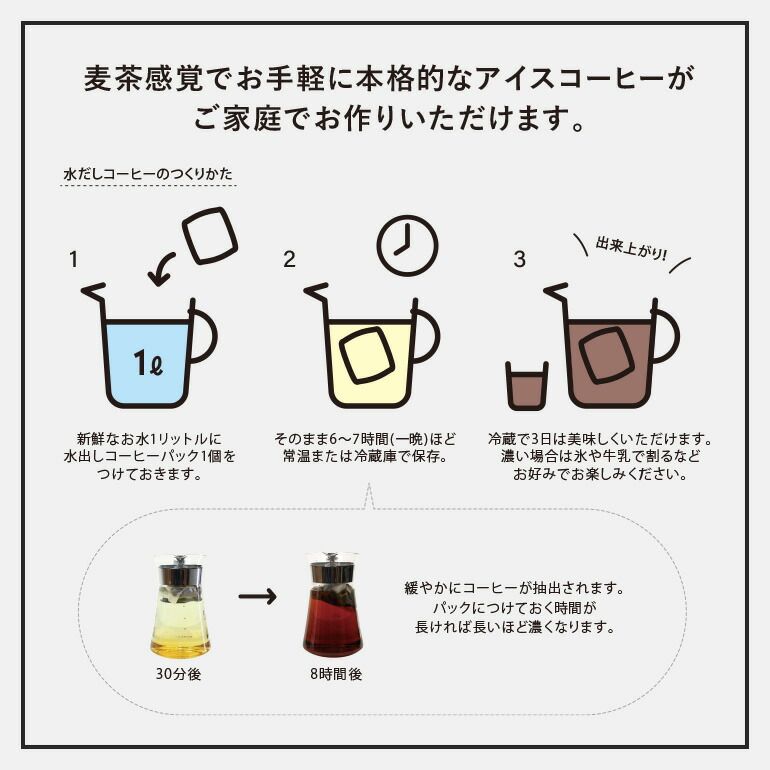 水出しコーヒーパックは緩やかに抽出され、濃度が変化。2、3日ずっと入れっぱなしにして、味わいの変化を楽しみながら美味しく頂けます。