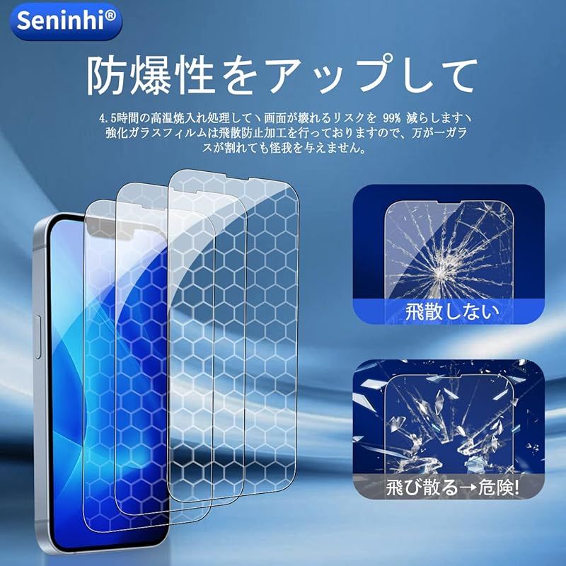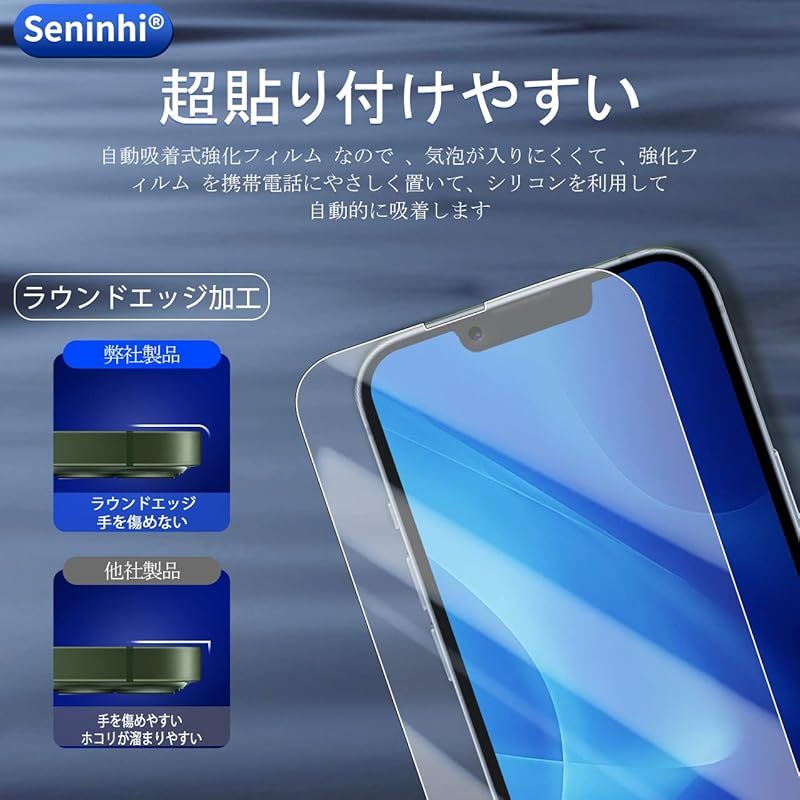 当店では他サイトにも商品を販売しているため まれに売り切れや取り寄せ中となる場合がありますがご了承ください。     【商品概要】 ★★★★★【対応機種】 iPhone14 専用です。本商品は日本素材のAGC国産旭硝子素材を採用して作られております。商品は一枚一枚手作業で検査しましたので、品質は非常に安定しております。ガラスフィルムの透過率は99.9%に達し、フィルムは0.26mmのゴールデン厚さを設計し、指紋ロック解除 などのタッチが敏感で、正しく連続的なタッチ使用体験を確保します。商品が届いた後、輸送中に破損したり(ガラス製品は壊れやすい可能性がある)、数が合わない場合がございましたら、お気軽にお問い合わせください。(18時間以内にお客様に満足できる返事を差し上げます。商品の問題に対しては、無料で交換または全額返金いたしますので、ご安心して弊社の製品をお買い求めください)。 ★★★★★【 業界最高品質ー 硬さ9h 】ガラスは硬すぎると、割れやすいです。弊社のガラスフィルムは業界最高レベルの9h硬さに達しました。4.5時間以上の高温焼入れ処理を行い、スクリーンプロテクターの圧強度は125mpaに達し、通常のガラスの5 倍になりました。しかもスクリーンプロテクターは衝撃を抑えるシリコンコーティングしており、万が一ガラスが割れても、ガラスの破片が飛散しなく、怪我されません。新しいアップグレードした光学プロジェクション技術を使って、液晶画面保護ガラスフィルム を改良した後、約99.15%の高い光線透過率に達し、より高い光透過率と超クリアな視覚体験を実現します。(大切な携帯電話の液晶画面を保護し、衝撃や表面のキズを防止します!) ★★★★★【 貼り付けやすい 】弊社のガラスフィルムは自動吸着式強化フィルムなので、気泡が入りにくいです。強化フィルムを携帯電話の画面に置いて、シリコンを利用して自動的に吸着します。日本のAGC旭硝子素材を使用し、3Dラウンドエッジ加工したので、使用中に鋭い角が指を怪我しなく、安心に使えます。3D処理して、超クリアで、画像の立体感もアップして、ロスレスな画質を実現します。更にメタカラー表示技術を搭載し、地金の視覚感を再現します。(強化フィルムが8枚あるので、とてもお買い得です)。 ★★★★★【 指紋防止/防水/油防止に優れます】通常のフィルムのようなラフなタッチ感じは一切ありません。更に超指紋防止、汗防止機能を備えます。スムーズなゲームプレイ体験を与えて、長時間の楽しみなどの利点もあります。10,006回以上に摩擦テストに合格し、指紋が残りにくいです。表面に滑らかで防水性に優れ、油防止にも優れます。(付着した指紋、水滴、汗、化粧品などは簡単に拭き取れます) ★★★★★【 Seninhi品質に関しては 】Seninhは長年にわたり、ガラスフィルの生産に専念しております。今まで最初の願望を保持しており、年間で500,006枚の携帯電話スクリーンプロテクターを販売しており、お客様に高品質のガラスフィルムを提供しようと目指しております。しかも技術の研究開発に挑戦し続けて、研究開発投資もどんどん増資しております。お客様に最高品質の製品を提供するよう努め、我々の製品は価値があると信じてください。万が一、「割れ」「サイズ違い」「初期不良」等の不具合がございましたら、お気軽に弊社までご連絡ください。(お問い合わせ先:「カスタマーサービス」に入り、「注文履歴」-「出品者」カスタマーサービスへご質問ください。私たちはお客様にご満足いただけるよう最善を尽くします。) ★★★★★【ガイド枠付き】製品には専用の位置決め枠を付属したので、フィルムを貼り場所を外れる心配がありません。しかも自動吸着がもっと楽で便利です。更にこの位置決め枠は使い捨てではなく、何度も繰り返して使用可能です。 【商品説明】 【Seninhi】iPhone14 保護フィルム最新登場!!! について: iPhone14 ガラスフィルム 【割れにくい強化素材】 2倍強化テクノロジー" を採用している、4時間以上強化処理を経て、市販の強化ガラスと比べ2倍の強度を持ています。 【飛散防止】 万一割れてしまったとしてもガラスが飛び散らずにより安全に処理できます。 【鮮明の画面】 装着しているのを忘れるほど、高い透過性があります。 デバイ スが持つ高精細な画面の美しさはそのまま! 携帯電話本来の画面を楽しむことができます。 【滑り抜群】 さらさら手触り! 優れたウィンドウディスプレイを持ち、指滑らかで、好感度で快適操作。 【国産旭硝子製】 世界最先端のテクノロジーを誇る旭硝子社製のガラスフィルムです。 鍵やナイフなど鋭利なもので切りつけても傷がつきにくいガラスフィルムです。 【指紋防止、コーディング耐油】 汗や汚れがついても拭き取るだけ。簡単なメンテナンスで携帯電話の液晶を常に綺麗に保つことができます。 【パッケージ内容】 強化ガラスフィルム ×2 強化カメラフィルム ×2 ホコリ除去シート×4 ウェットアルコールシー