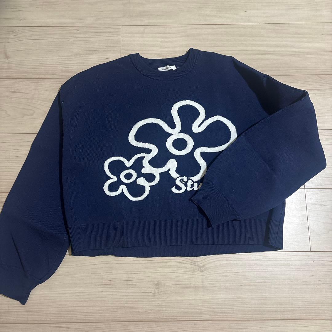 ラ*)様 花柄プリント クロップドニット セーター ネイビー