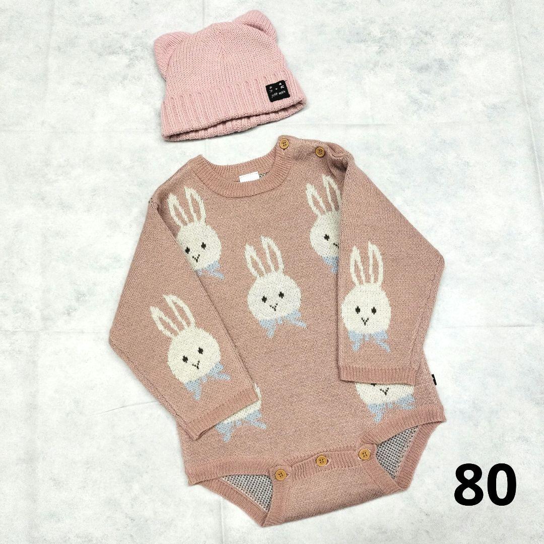 バースデイ フタフタ うさぎ ニットロンパース プティマイン 猫耳ニット帽 2点