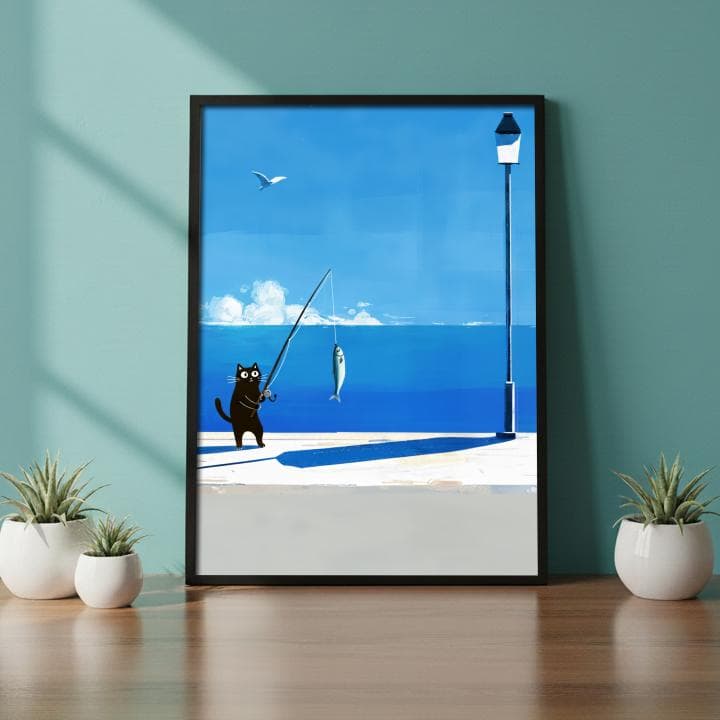 【タイムセール価格】 海で釣りをする黒猫のポスター 北欧 インテリア A4
