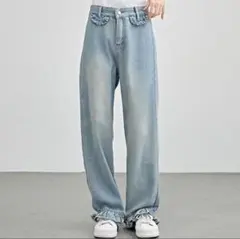 Chic 【2XL】ライトブルー デニムパンツ ダメージ加工 ワイドパンツ