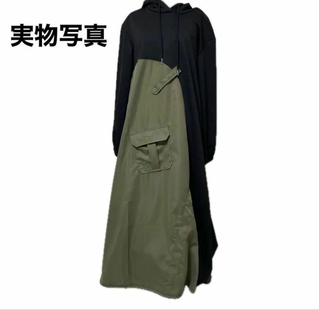 ミリタリー風 配色切り替え パーカーワンピース ロングワンピース ロングスカート