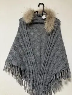 グレー ニット ポンチョ フリンジ ファーラクーン付き