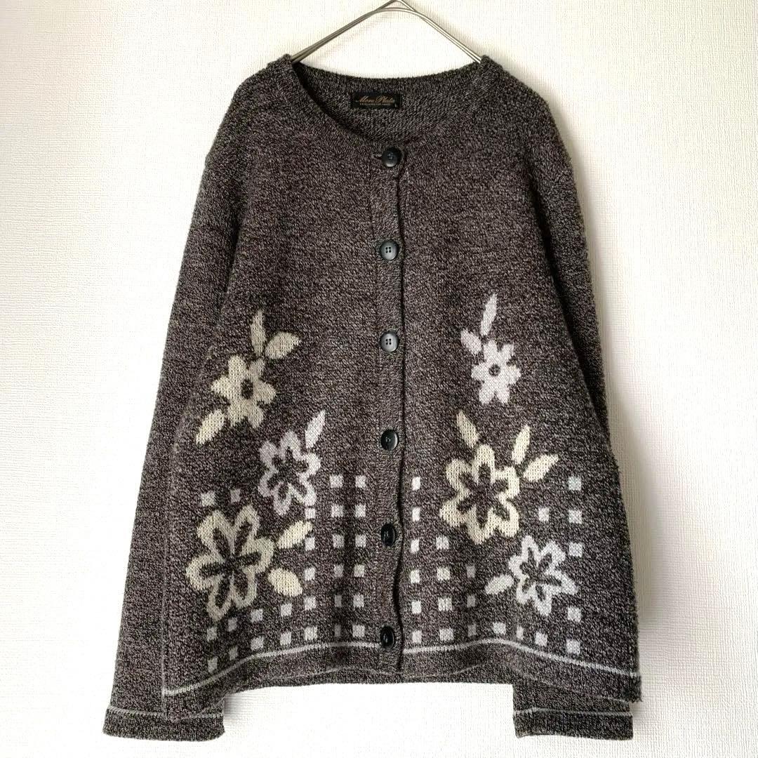 美品☆More Plata ラウンドネック 花柄 ニットカーディガン 羊毛 L