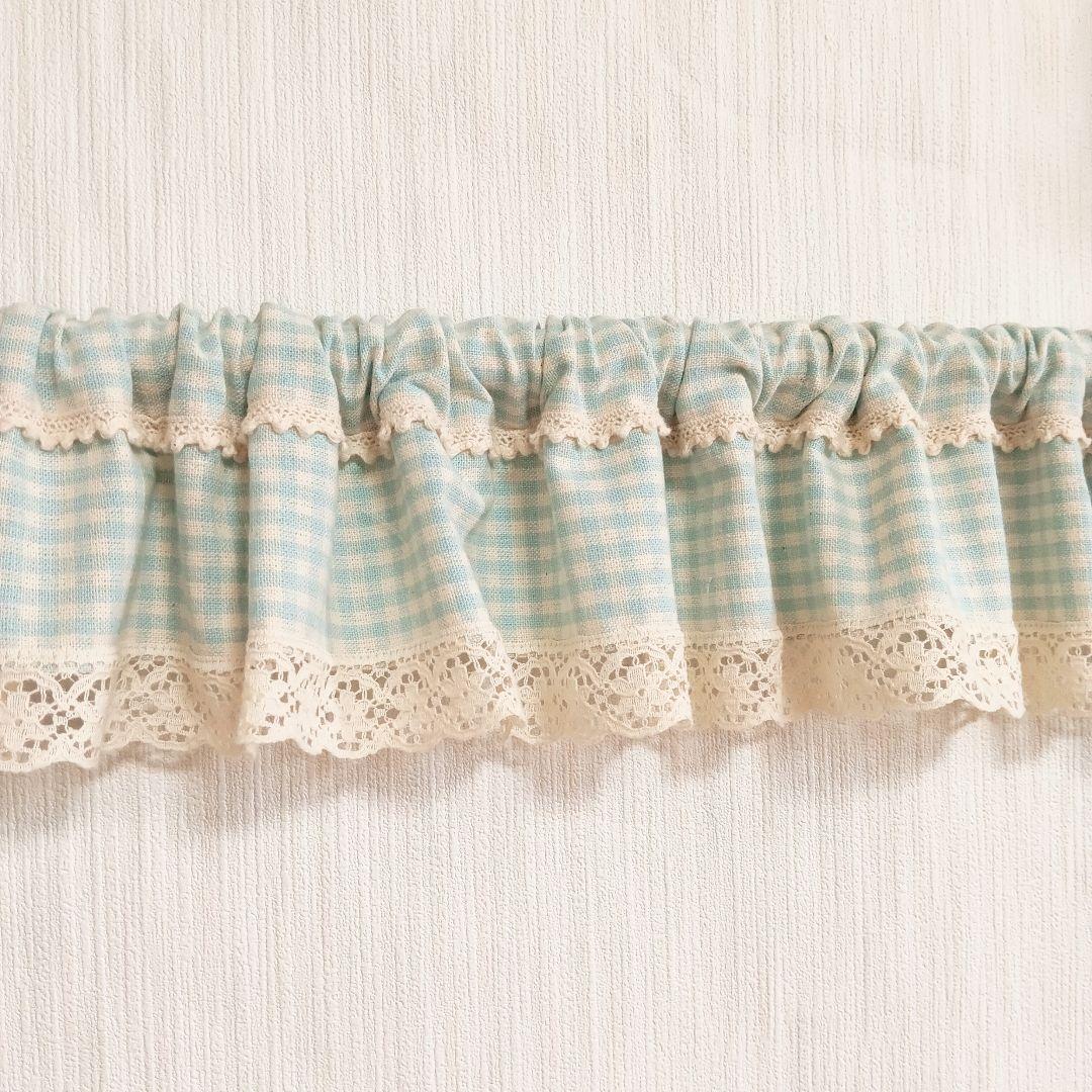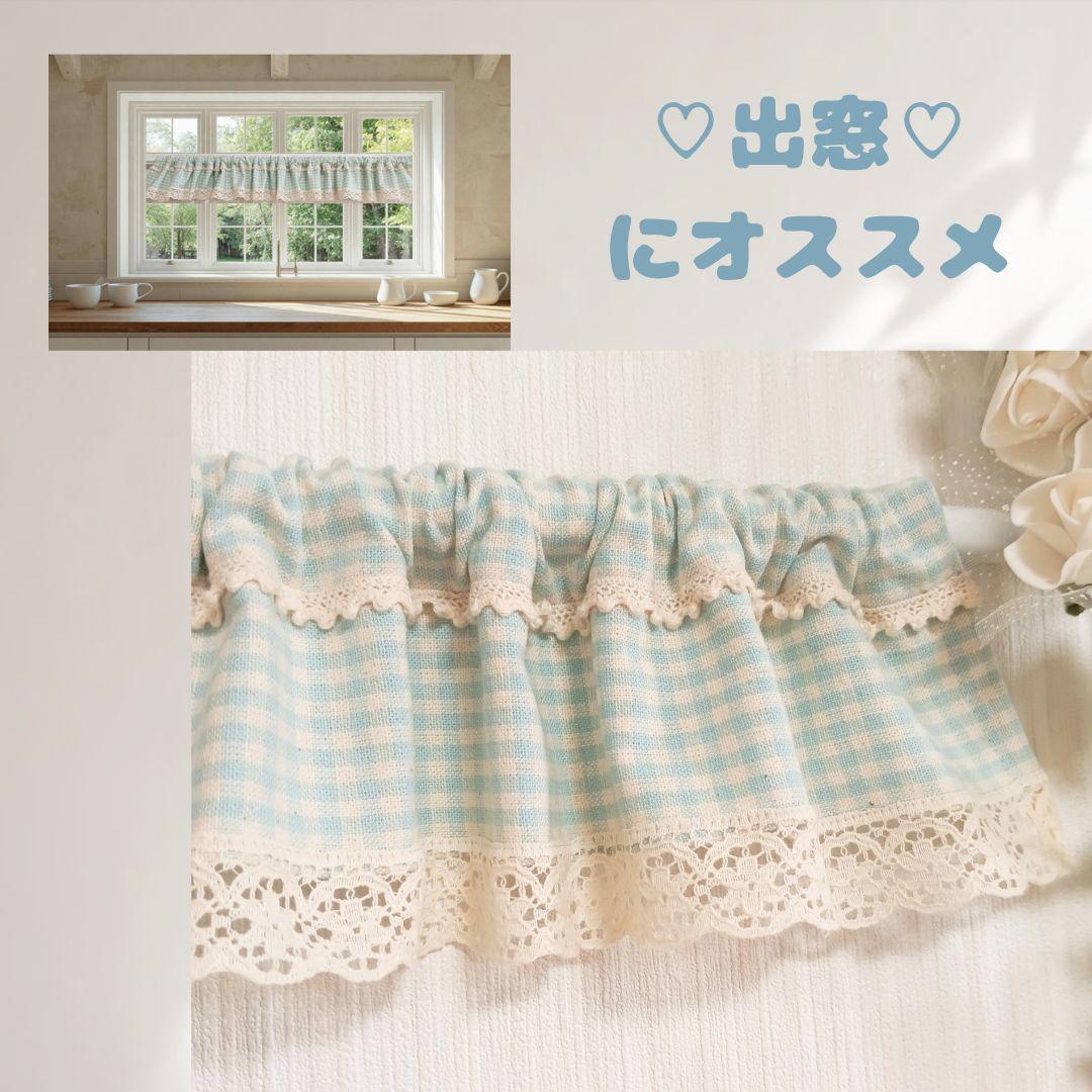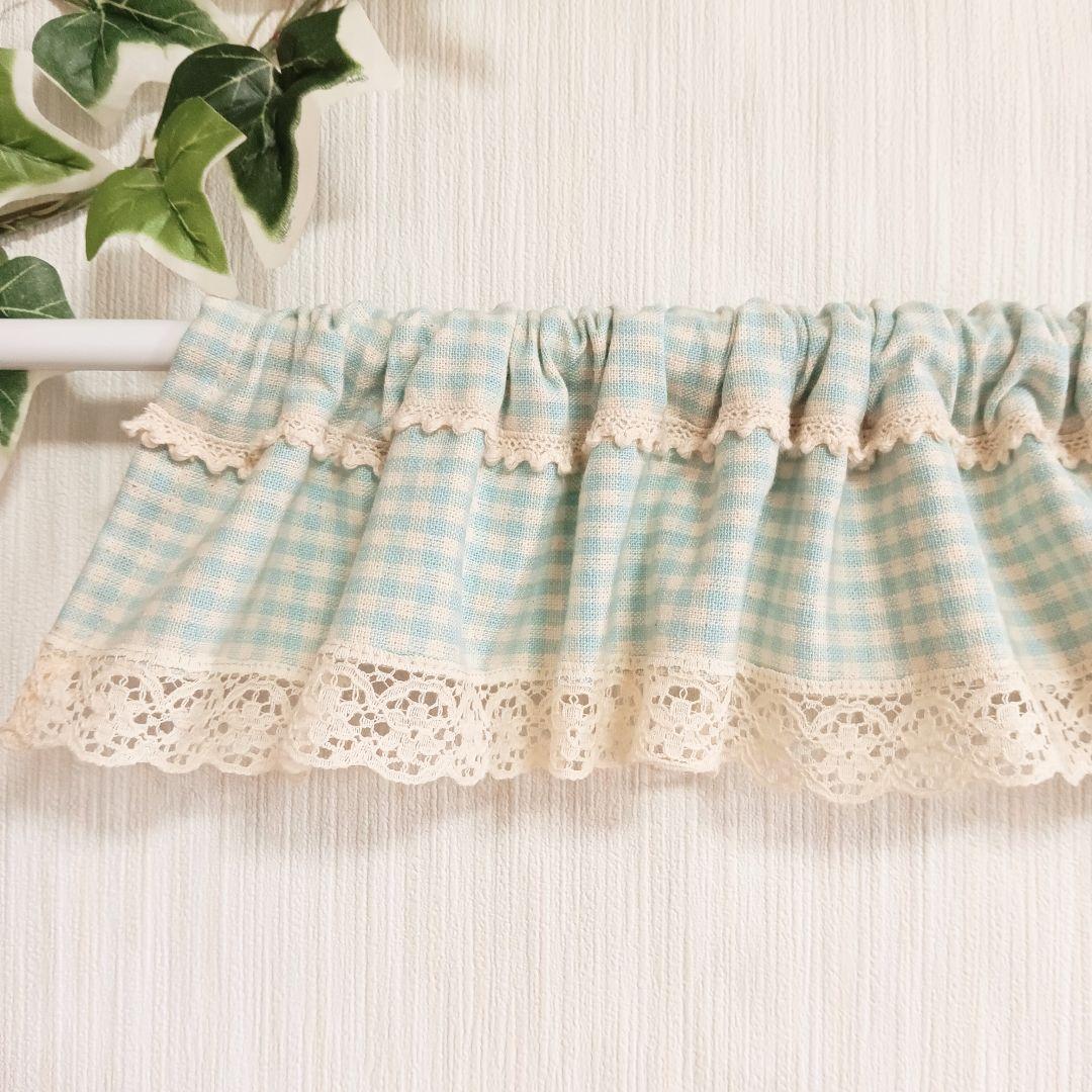綿麻リネンのバランスカフェカーテン♥チェック♥水色♥トーションレース♥