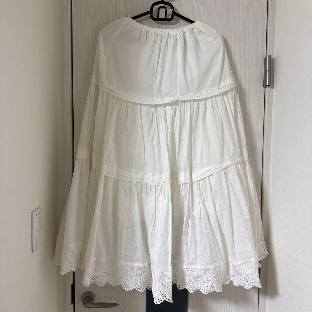AuieF ホワイト コットン フレアスカート レース装飾
