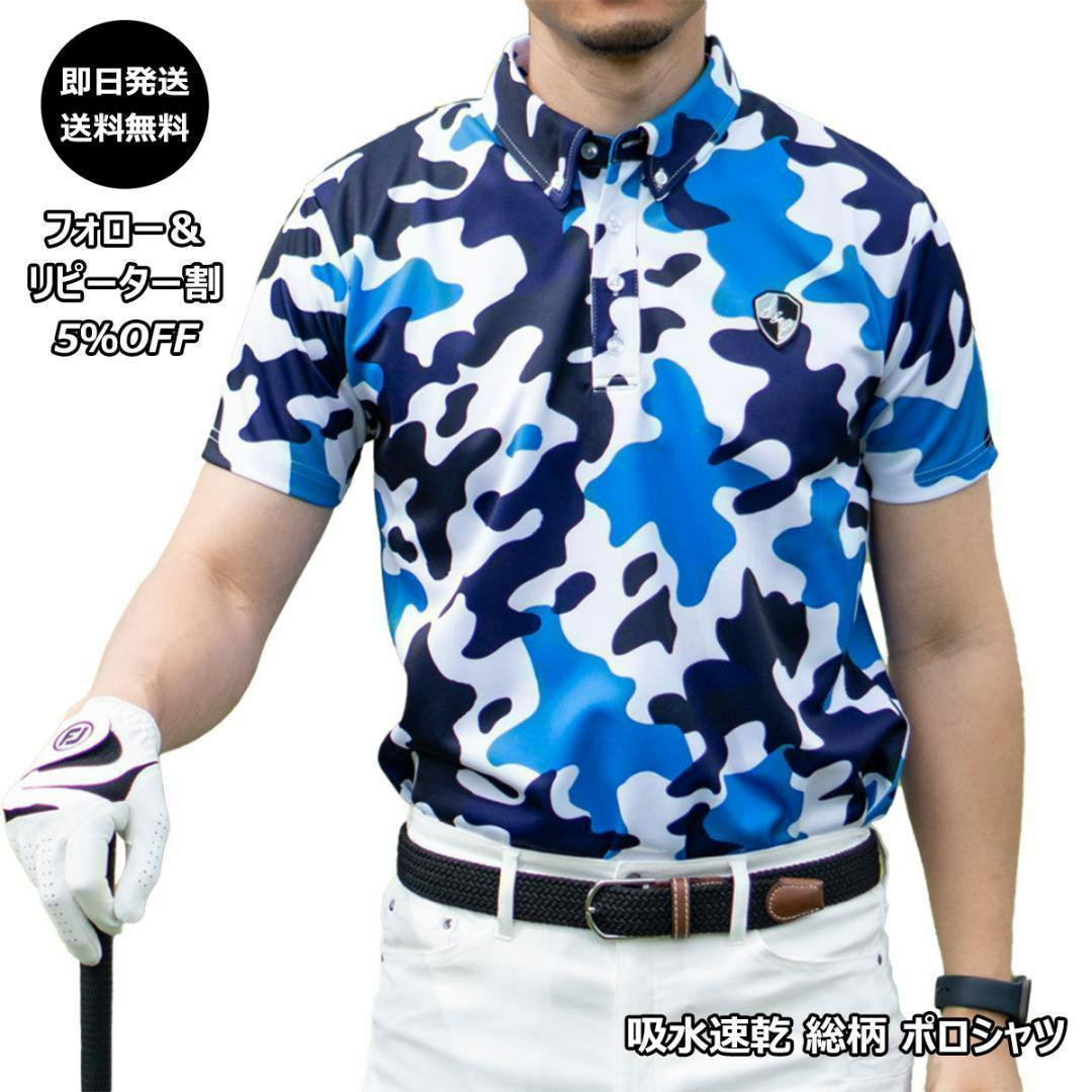 N-吸水速乾 総柄 ポロシャツカモホワイト 青L ゴルフウェア スポーツL