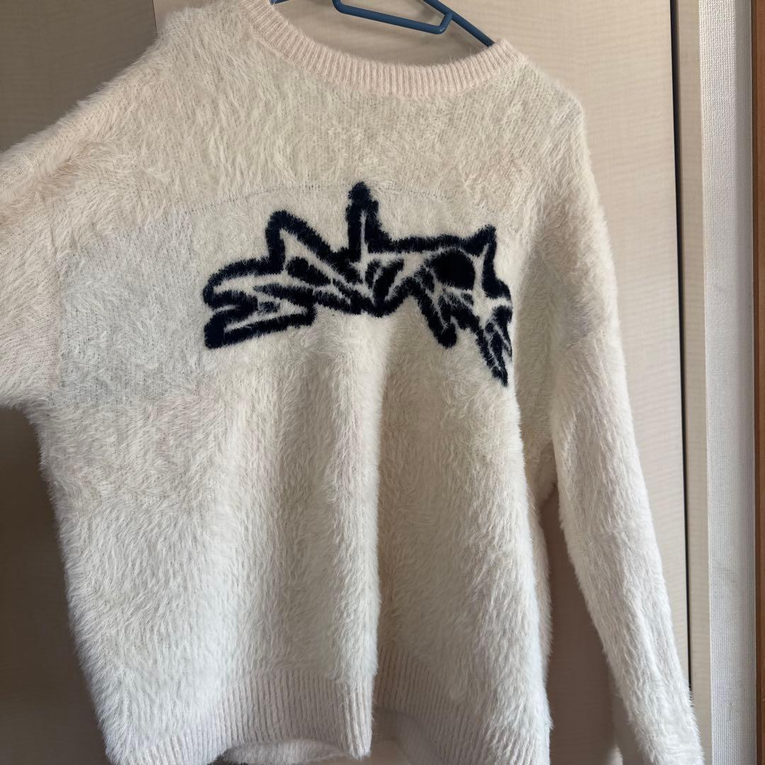 ホワイトニット セーター 黒ロゴデザイン