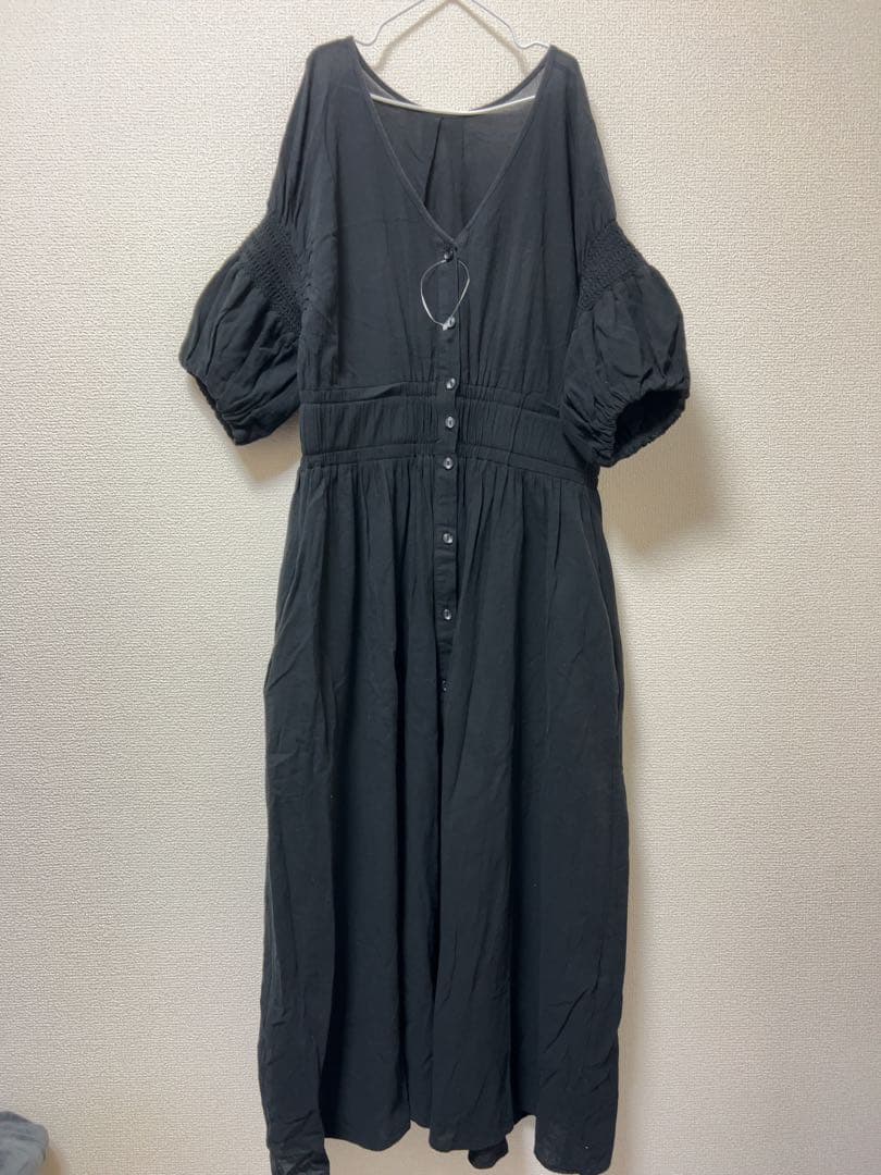ベイフロー黒のロングワンピース Vネック パフスリーブ