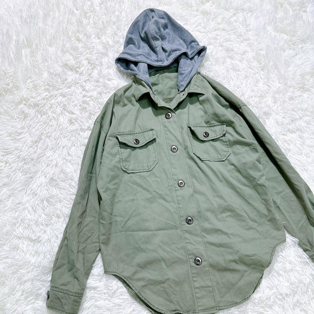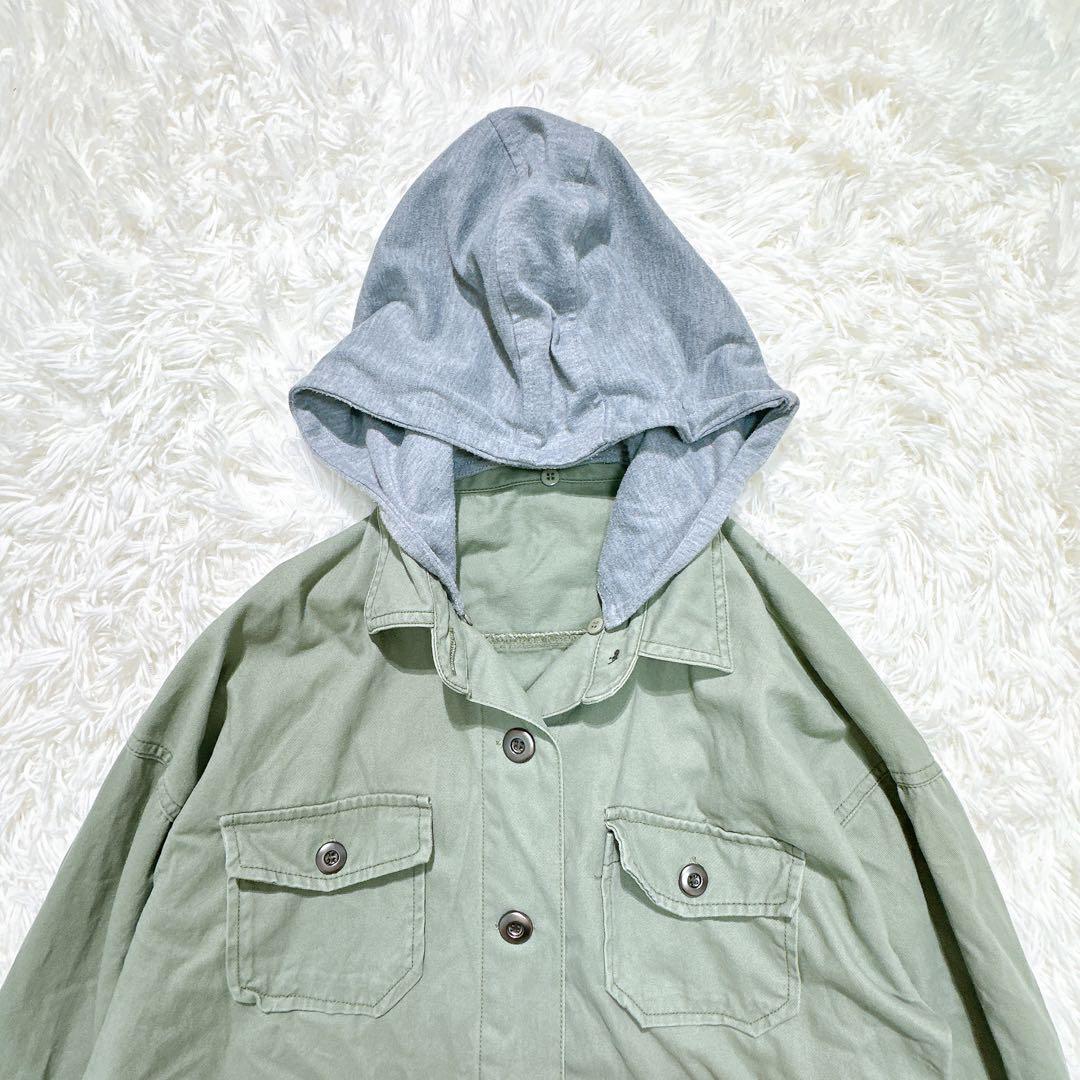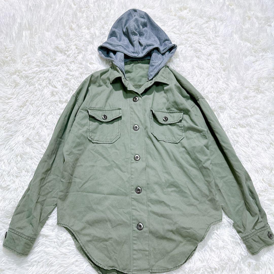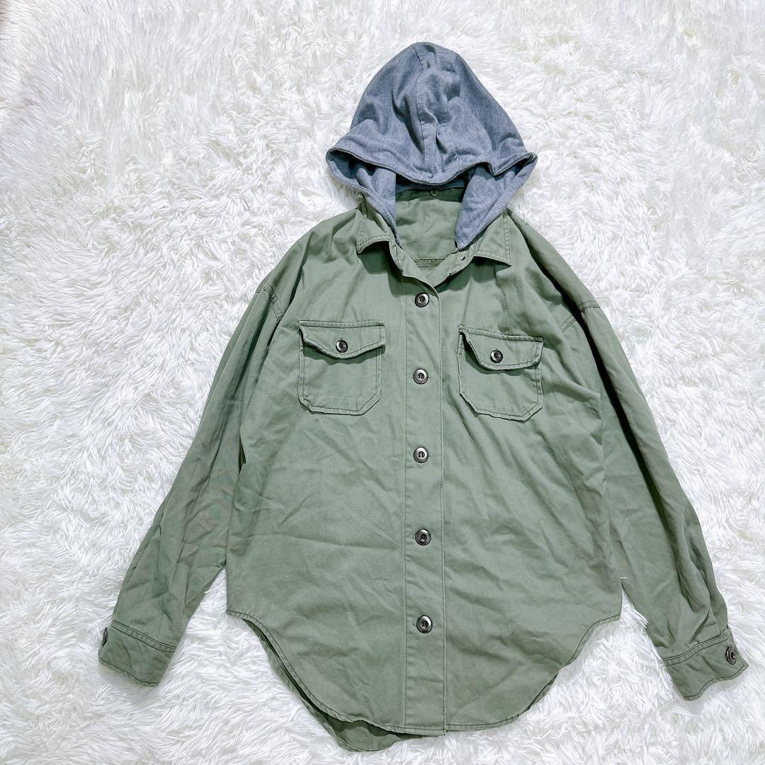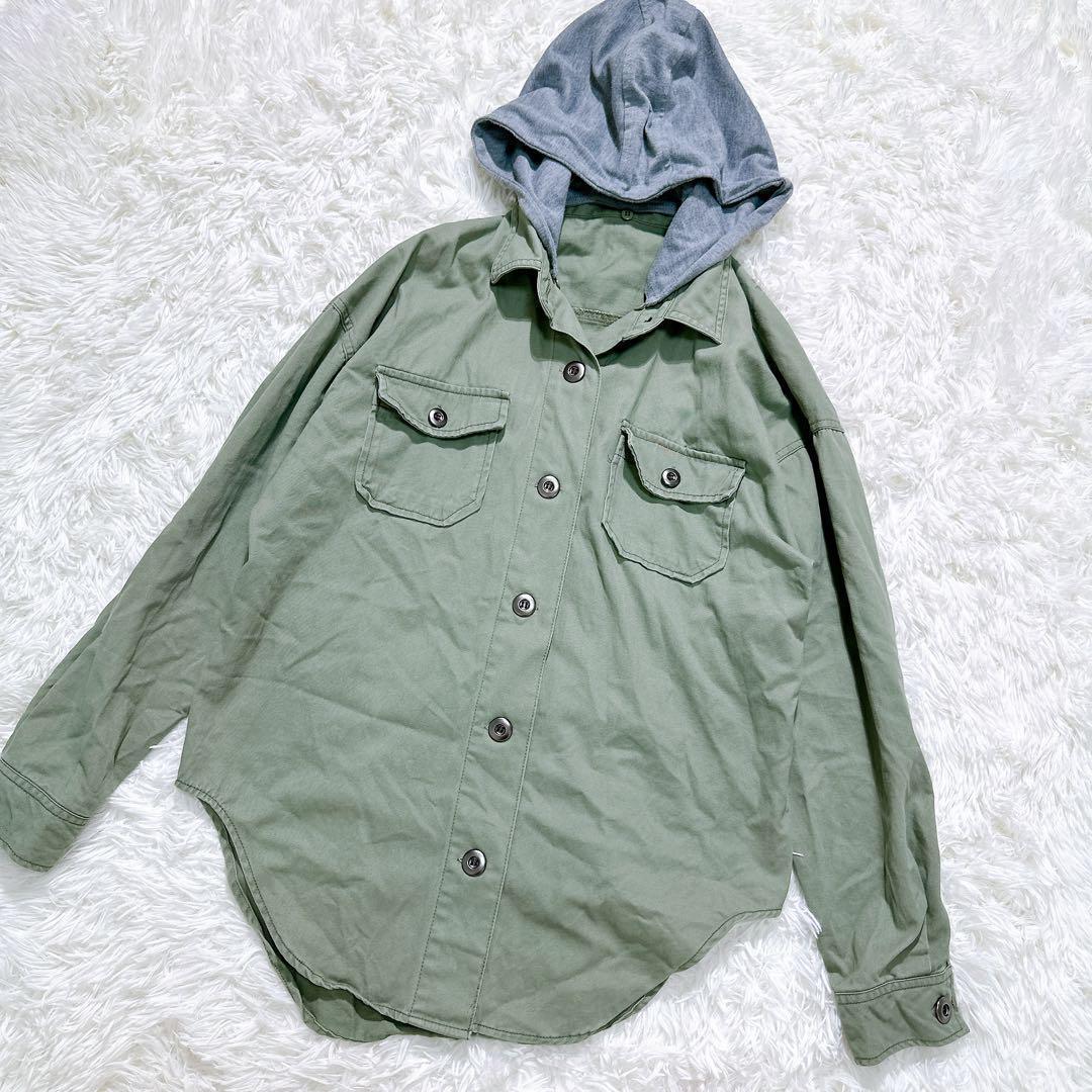 【SPINKLE】フード付ミリタリーシャツ 重ね着風 ストリート 刺繍入り