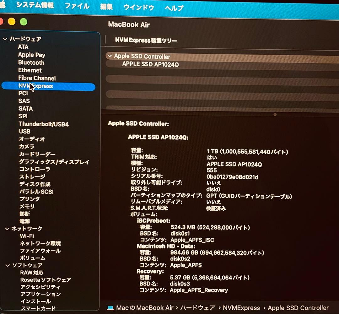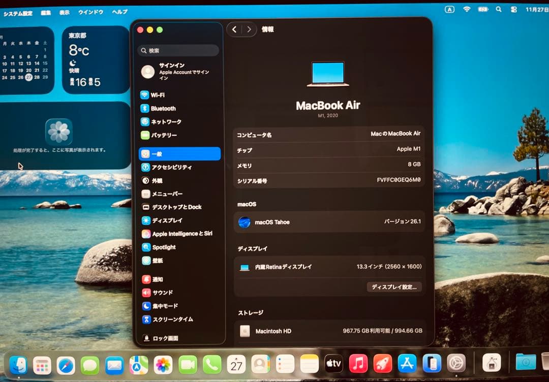 美品 MacBook Air M1チップ大容量SSD: 1TB バッテリー92%