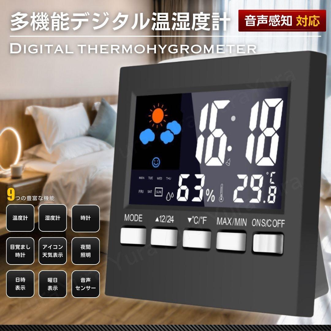 置き時計 デジタル 湿度計 温湿度計 音声感知 目覚まし 小型 アラーム 天気