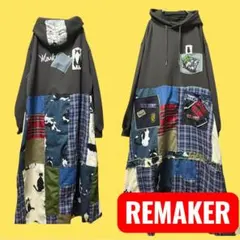F✨ゆったりパーカー✨古着リメイクワンピース✨パッチワーク✨猫 紺チェック