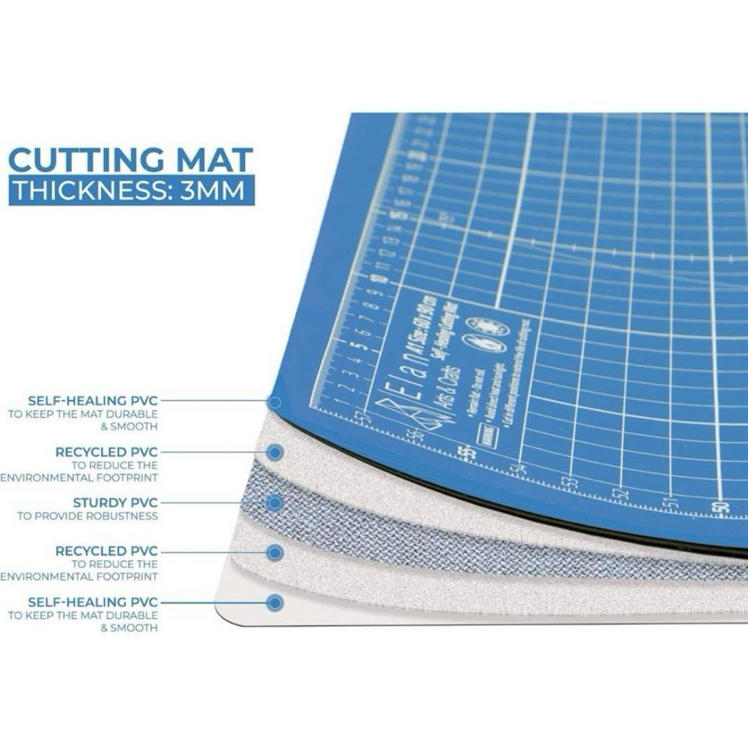 即購入・深夜無言購入OK❣️ *送料無料!24時間以内発送を心がけています *商品確認のため開封しています ★不具合は評価前にご連絡ください.ᐟ.ᐟ #ぴのshop の商品一覧はコチラ✨☜ ··························································· カッターマットA3サイズ(1枚)です❁⃘*.゜ ※新品未使用品ですが、商品確認のため開封した ので未使用に近いとしています。 <両面グリッド入り> 片側が青、反対側が水色のグリッド入り両面仕様のカット版です。便利な1cmグリッドに加えコンパスやモノサシ、用紙サイズなど多数の便利な測定定規も導入。線を消えにくくし、長くお使い頂くための工夫を施しています。 <製品情報> サイズはA3 (44 cm x 30 cm) 厚みはそれぞれ3mmの5展開です。 青と水色の両面仕様により、見やすさと目へのやさしさを実現しています。 大事な家具の数々をしっかり保護。 木製のテーブルの上でも安心してご使用頂けます。縫製用として、手芸用として、プラモデル組み立て用として、デスクマットとしてなど使い方は自由自在です。 16-5 259