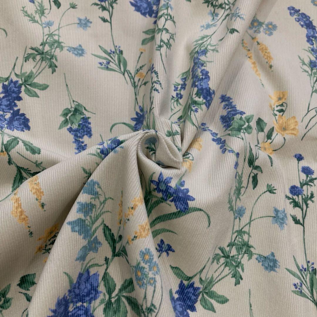 はぎれ アイボリー×ブルーボタニカルフラワー柄コーデュロイ生地 1M 植物柄花柄