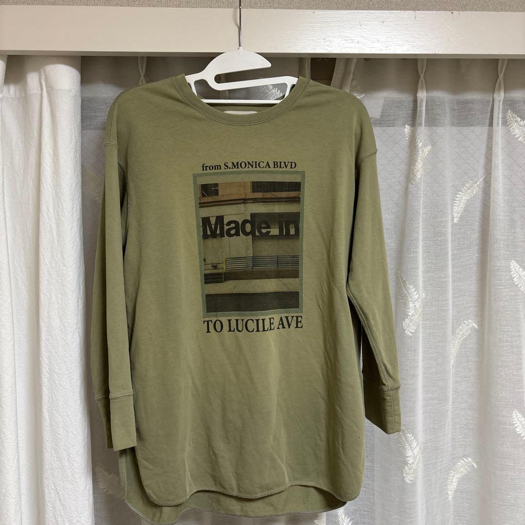 オリーブ色 プリント入り長袖Tシャツ サイズ2