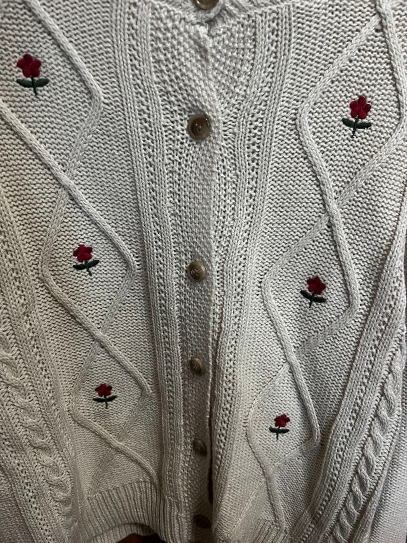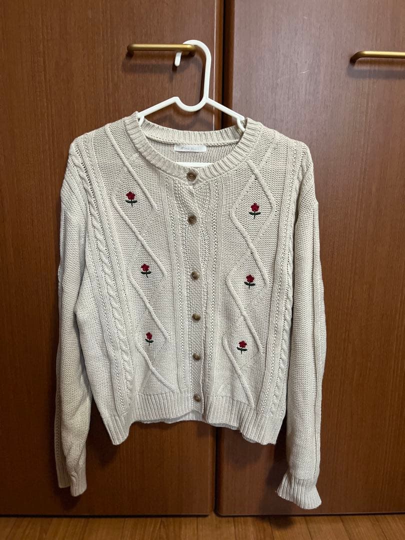 ehka sopoベージュ ニット花刺繍カーディガンF