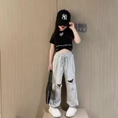 ダメージ加工グレー長ズボンとクロップドTシャツ ダンス衣装に