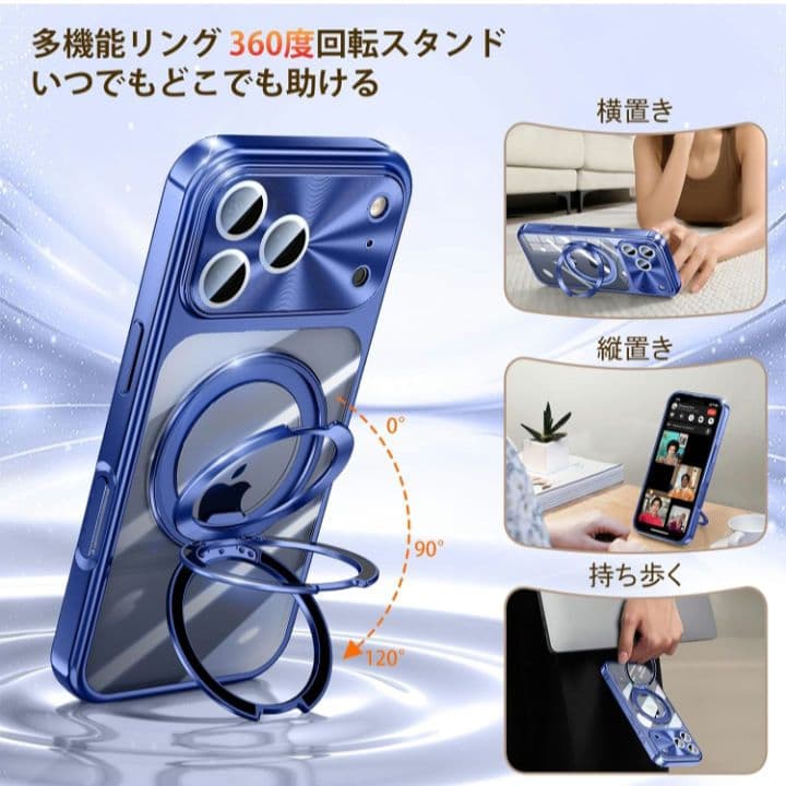 360度回転リングスタンド付 iPhone 17 pro max ケース ブルー