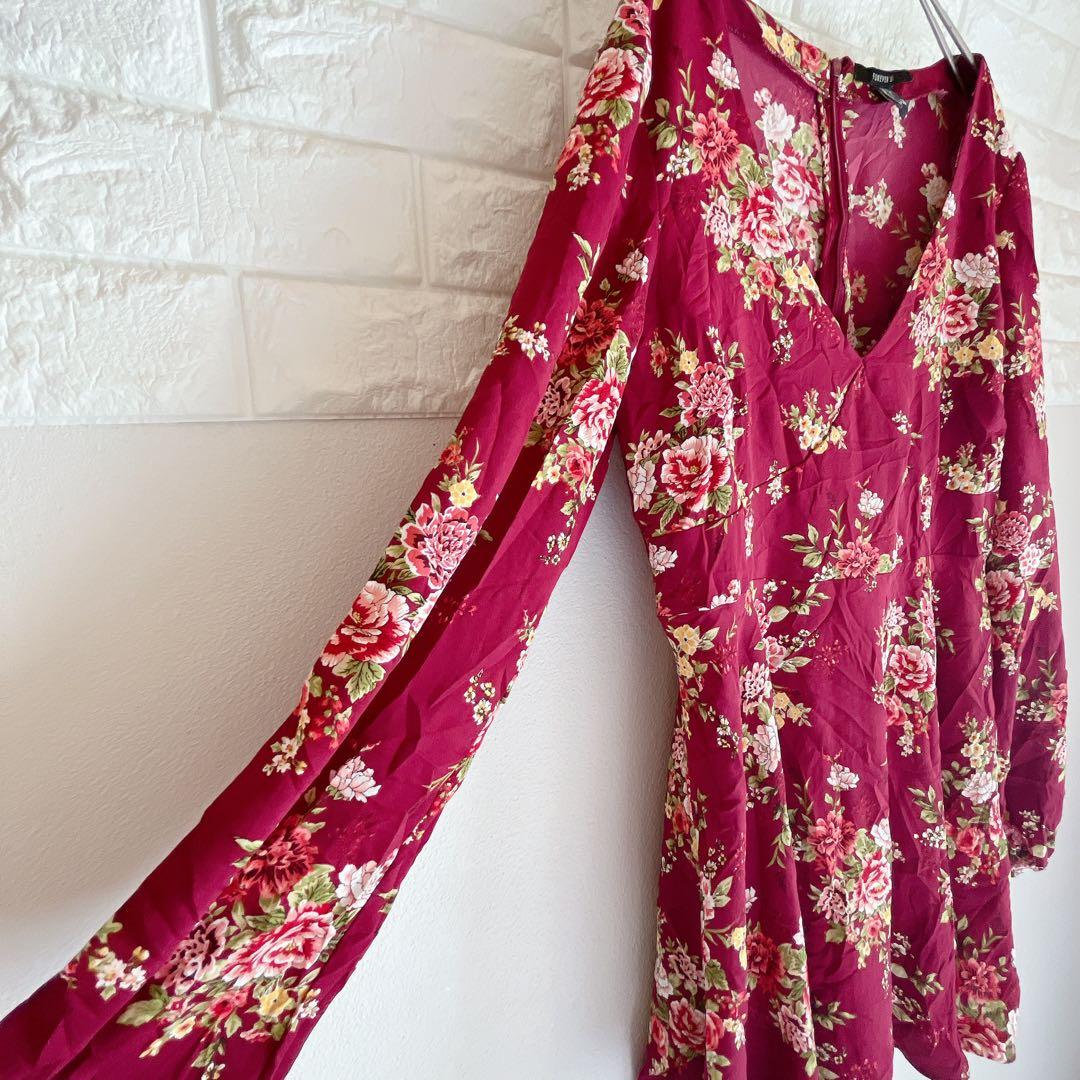 【FOREVER 21 】L 長袖チュニック フラワープリント(ワインレッド)