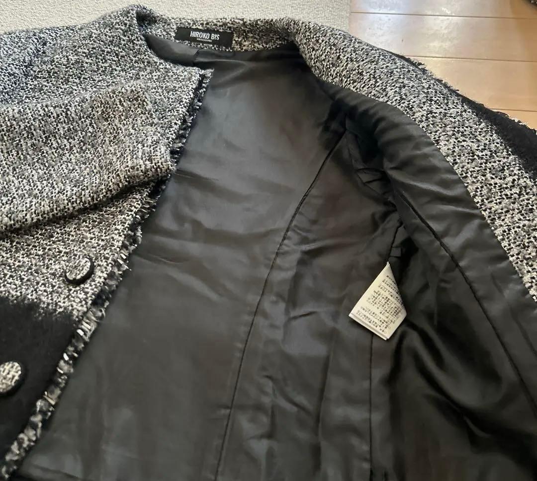 美品 HIROKO BIS ツィードジャケット ノーカラー グレー系×黒
