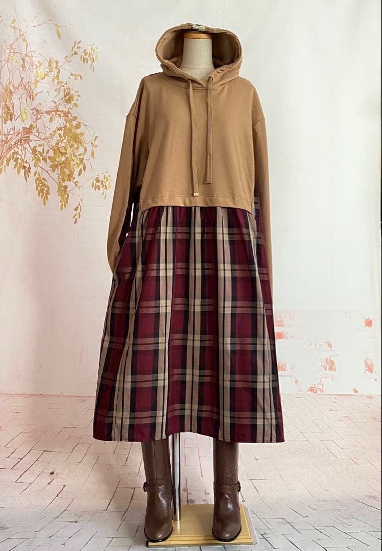 新品 BIGタータンチェックスカートドッキングスウェットパーカーワンピース茶系L