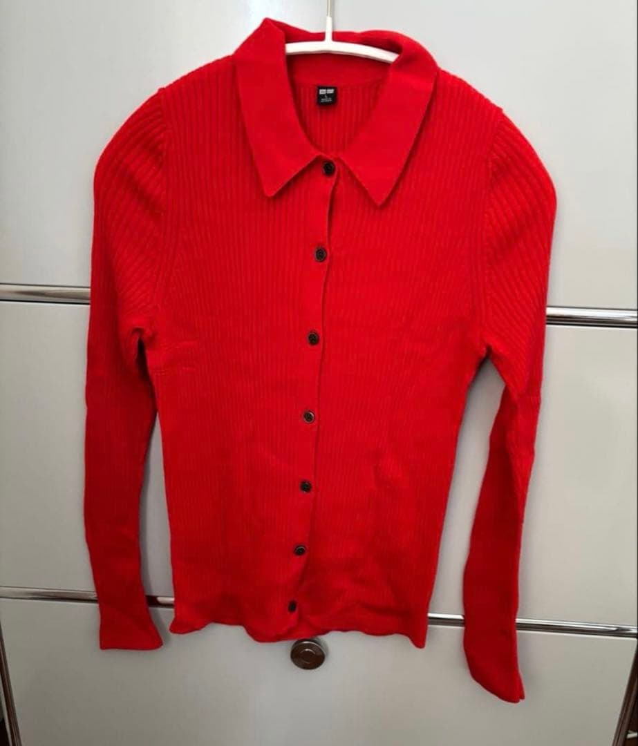 ユニクロ エクストラファインメリノリブポロカーディガン L レッド 赤