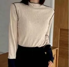 リブ編み長袖トップス ベージュ×ネイビー XL