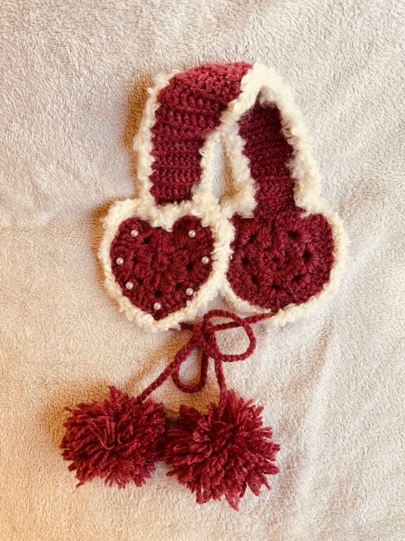 かぎ編み ハートイヤーマフ ラズベリーレッド