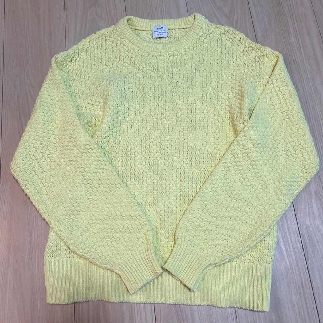 coen コーエン 洗えるポップコーンニット イエロー 長袖 リブ編み