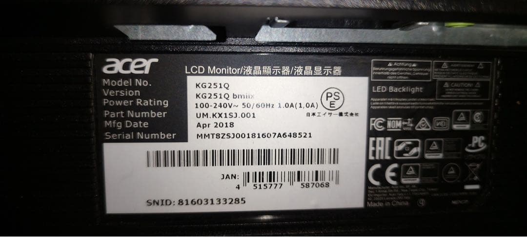 Acer ゲーミングモニター KG251Q bmiix VESA スピーカ内蔵